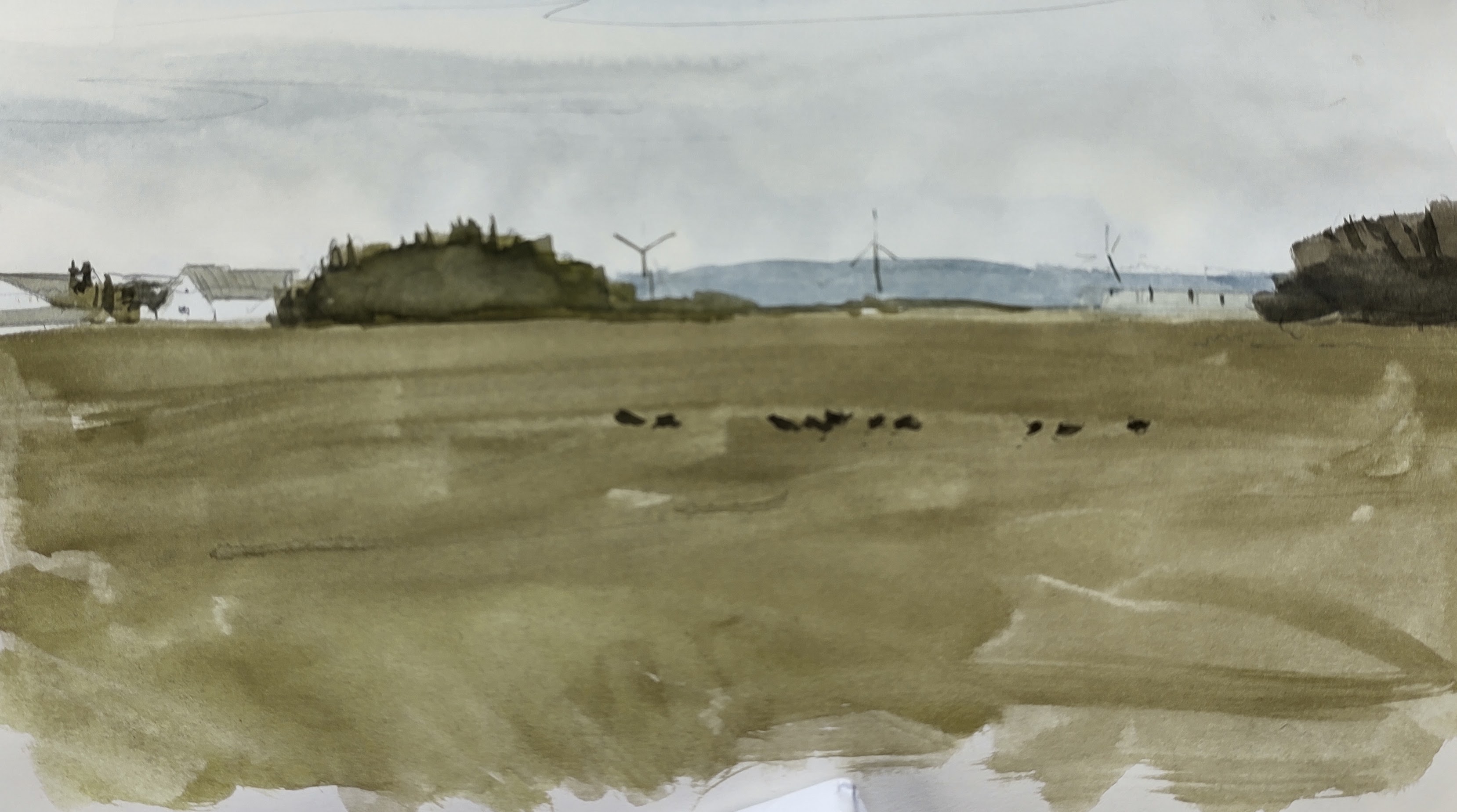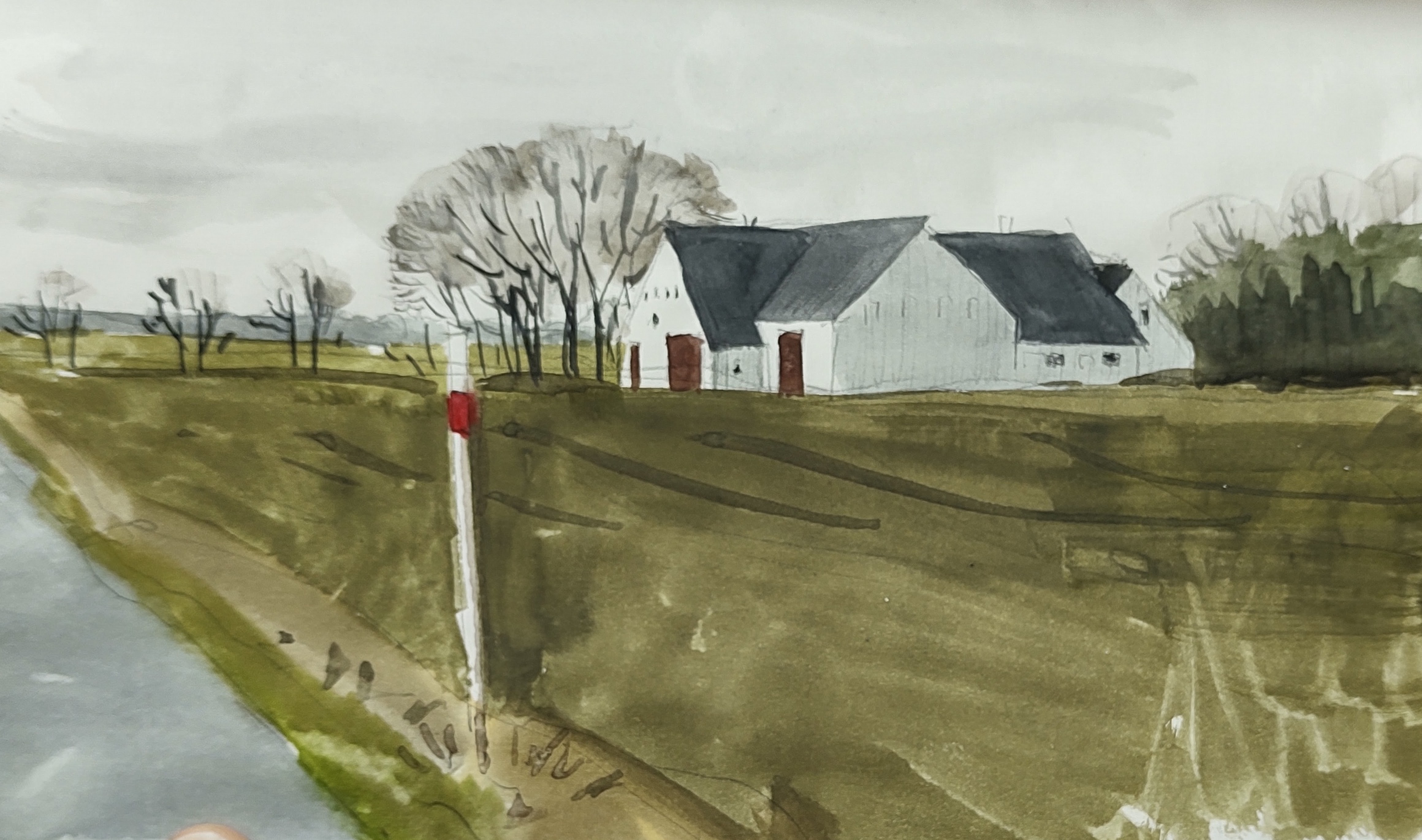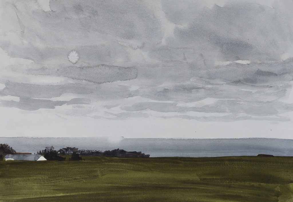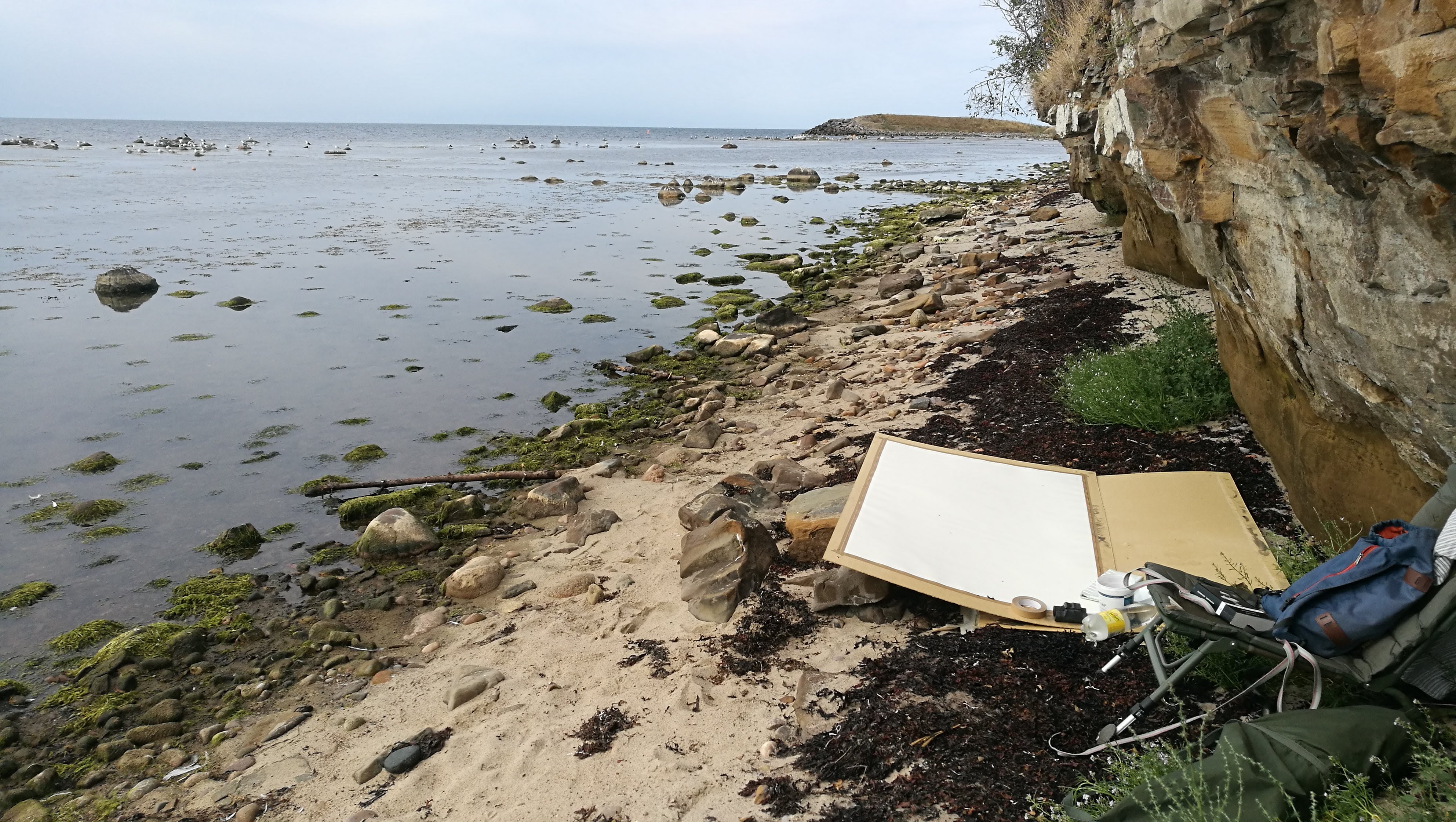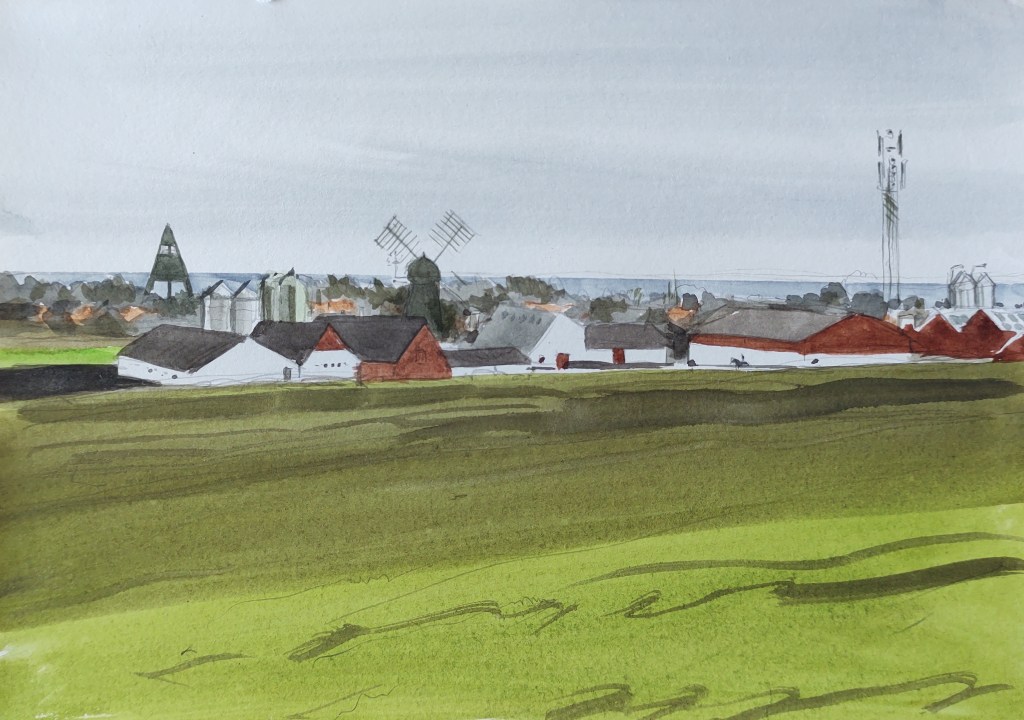I headed inland again, back into the forest, following for a while ‘The Green Ring’, a path system that partly encircles the port town of Rønne, Bornholm’s largest town and administrative capital. I stopped and painted a field of wild carrot and dock against a backdrop of Rønne’s industrial skyline.