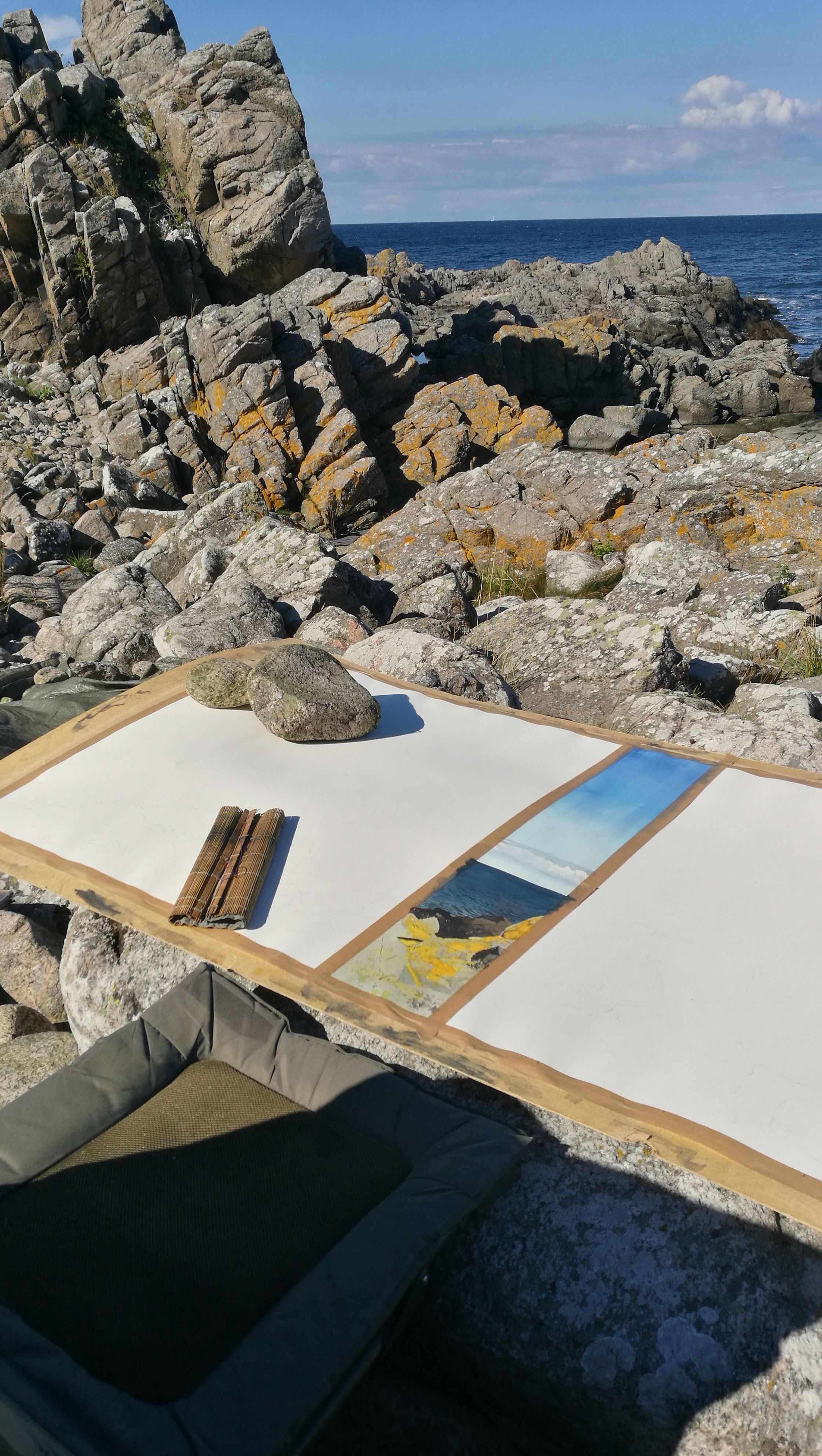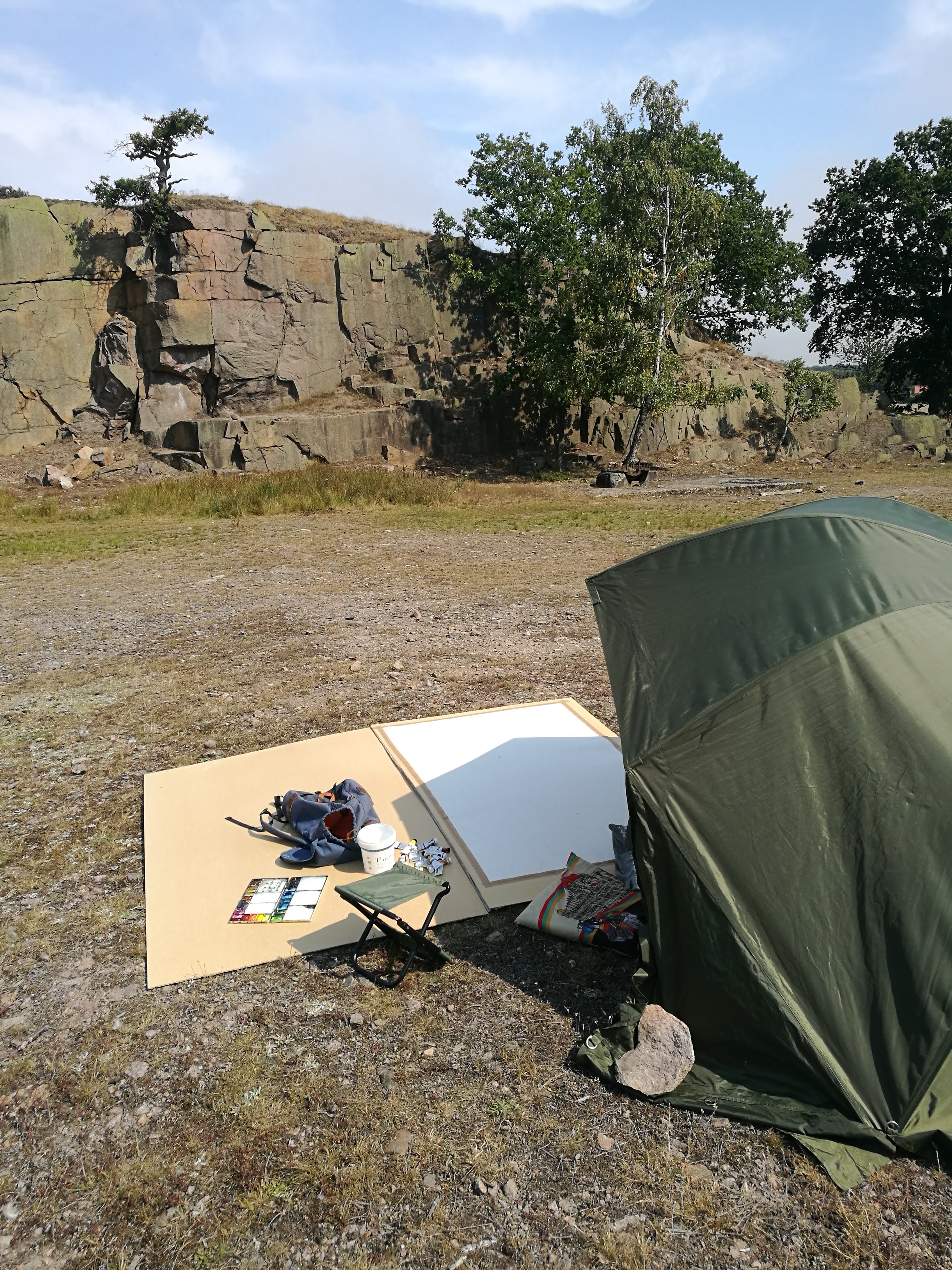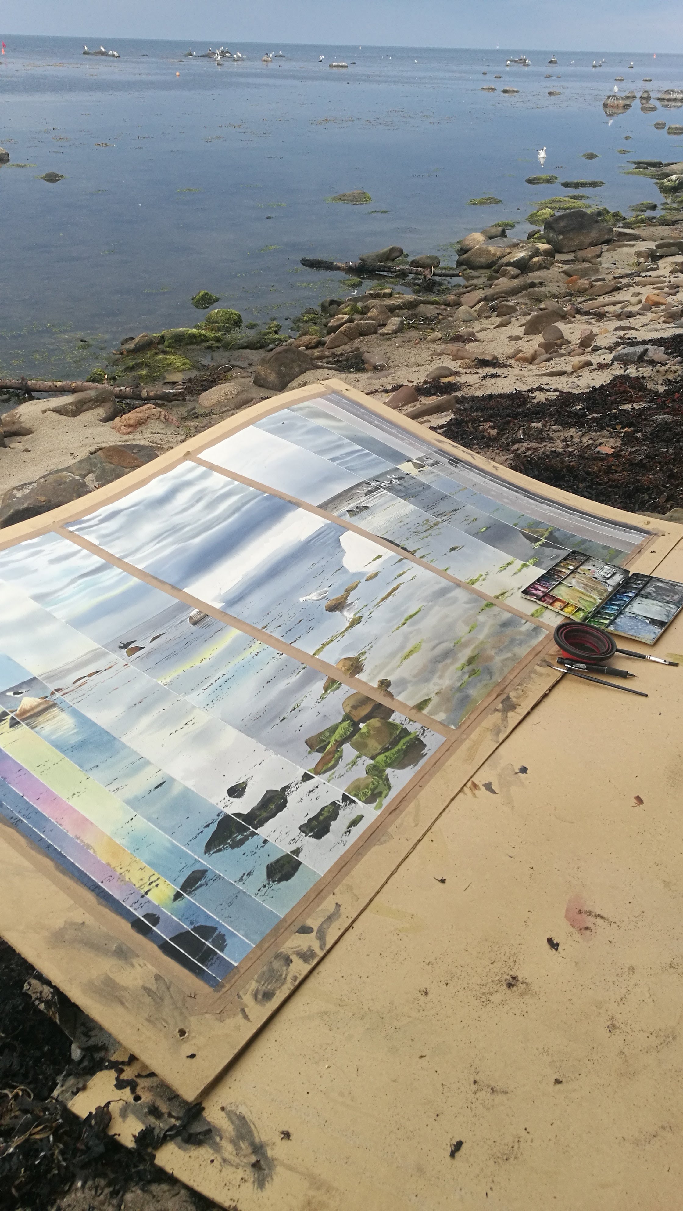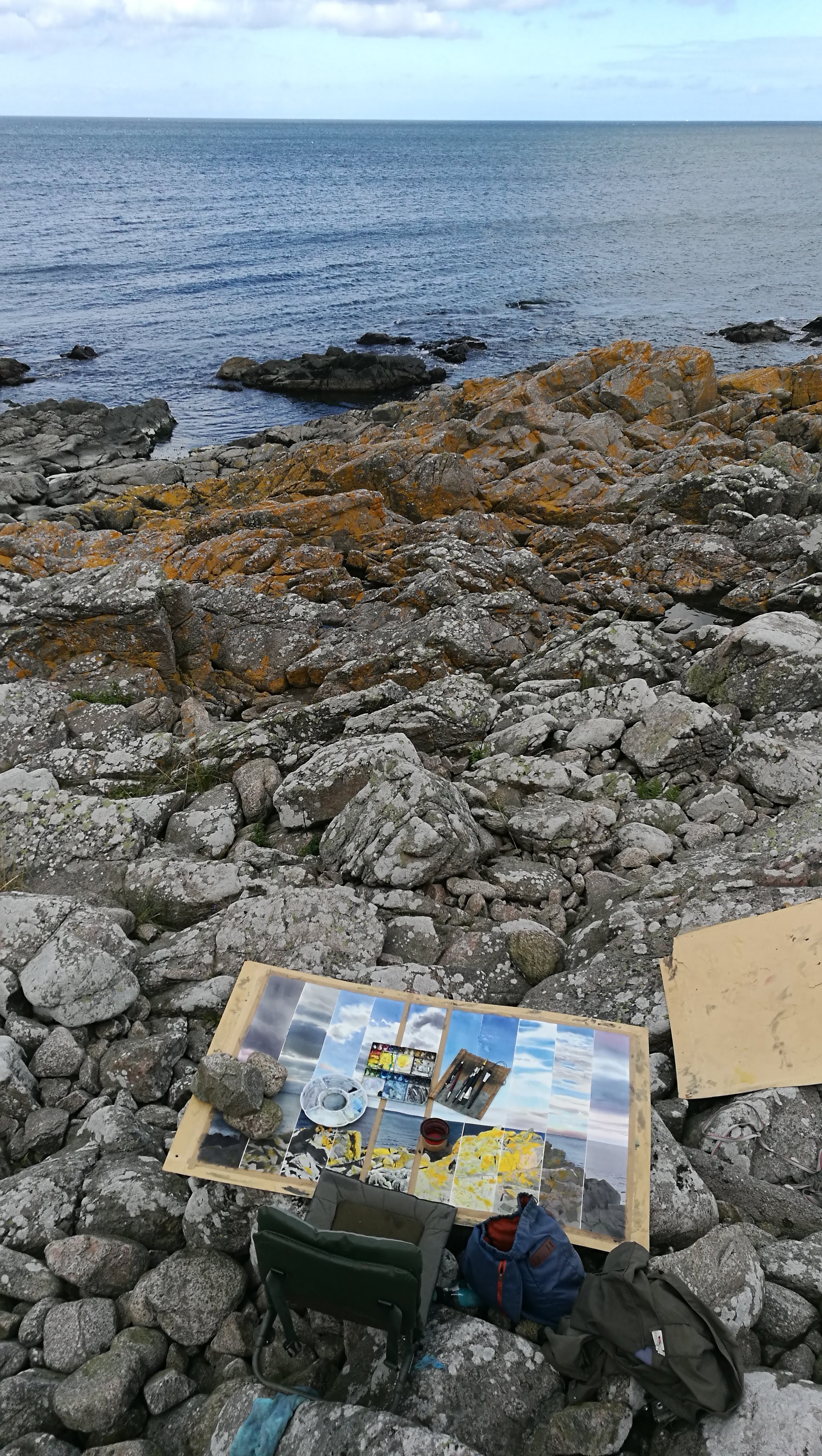 I headed inland again, back into the forest, following for a while ‘The Green Ring’, a path system that partly encircles the port town of Rønne, Bornholm’s largest town and administrative capital. I stopped and painted a field of wild carrot and dock against a backdrop of Rønne’s industrial skyline.