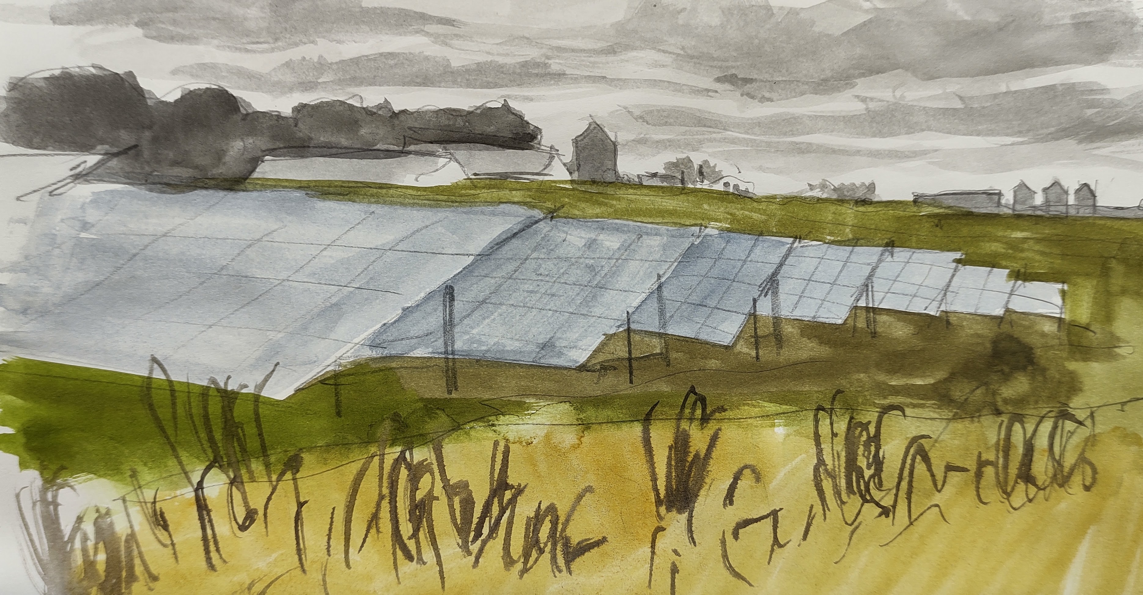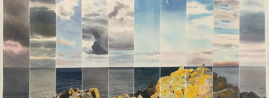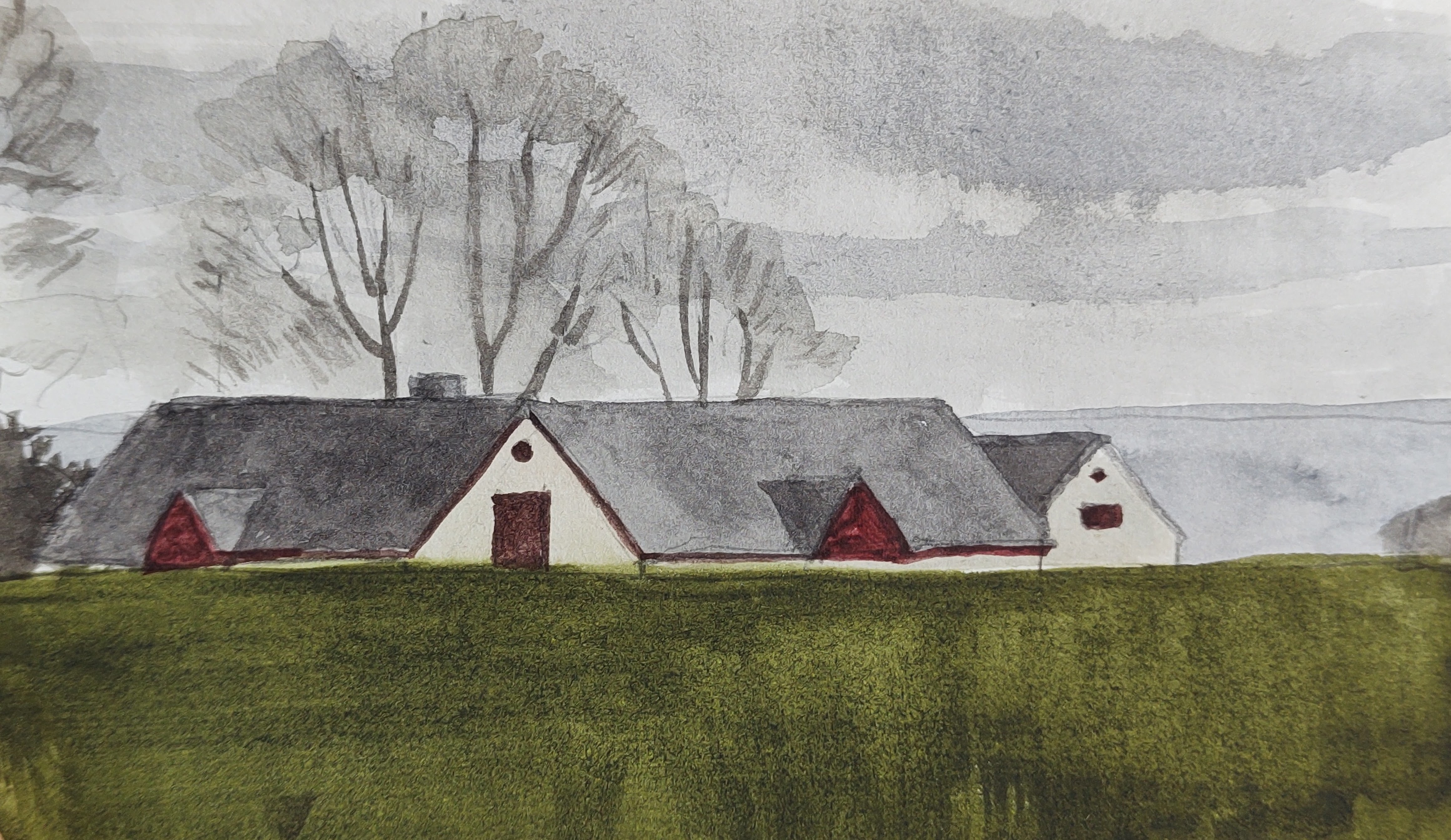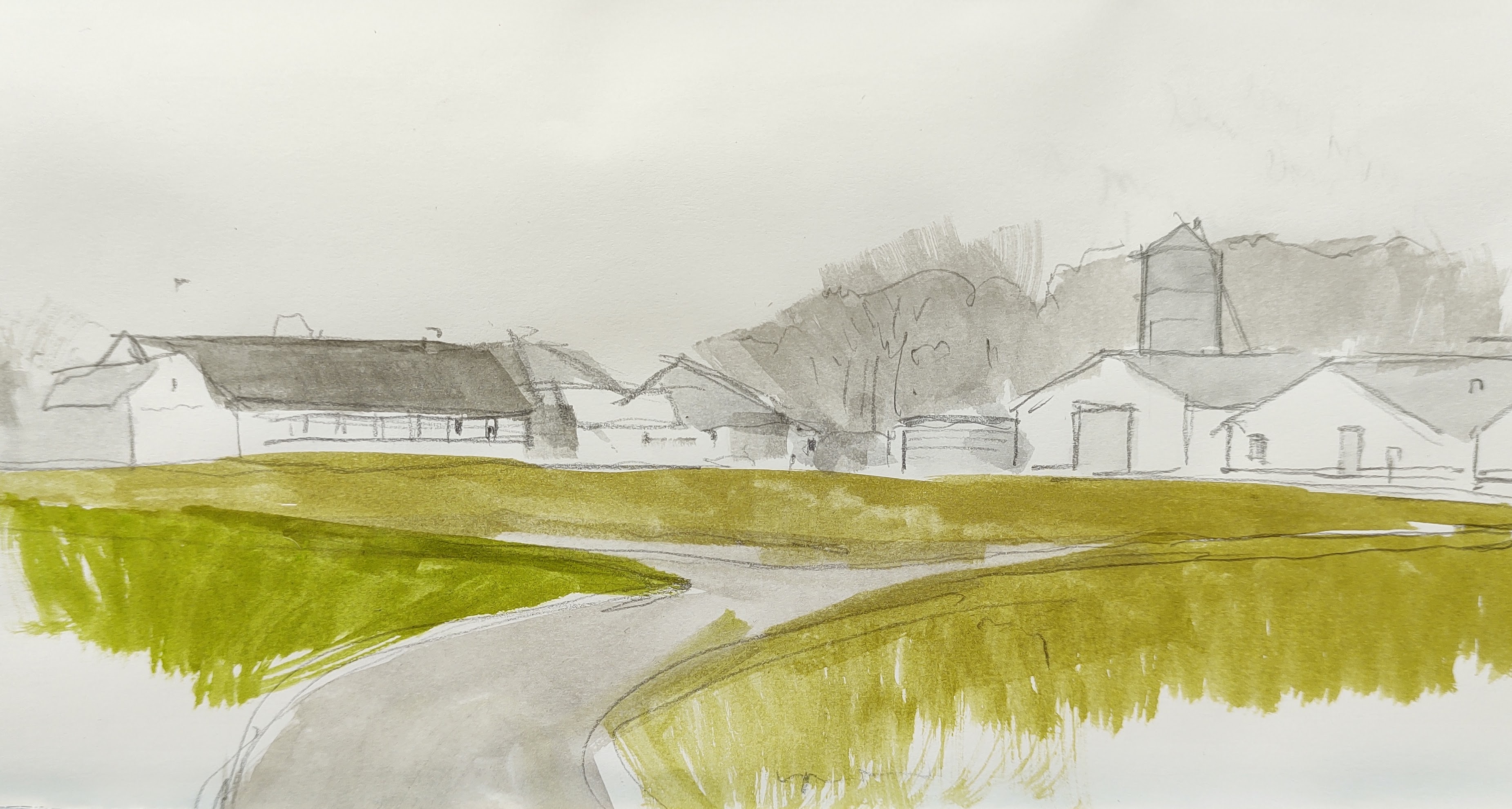 I headed inland again, back into the forest, following for a while ‘The Green Ring’, a path system that partly encircles the port town of Rønne, Bornholm’s largest town and administrative capital. I stopped and painted a field of wild carrot and dock against a backdrop of Rønne’s industrial skyline.