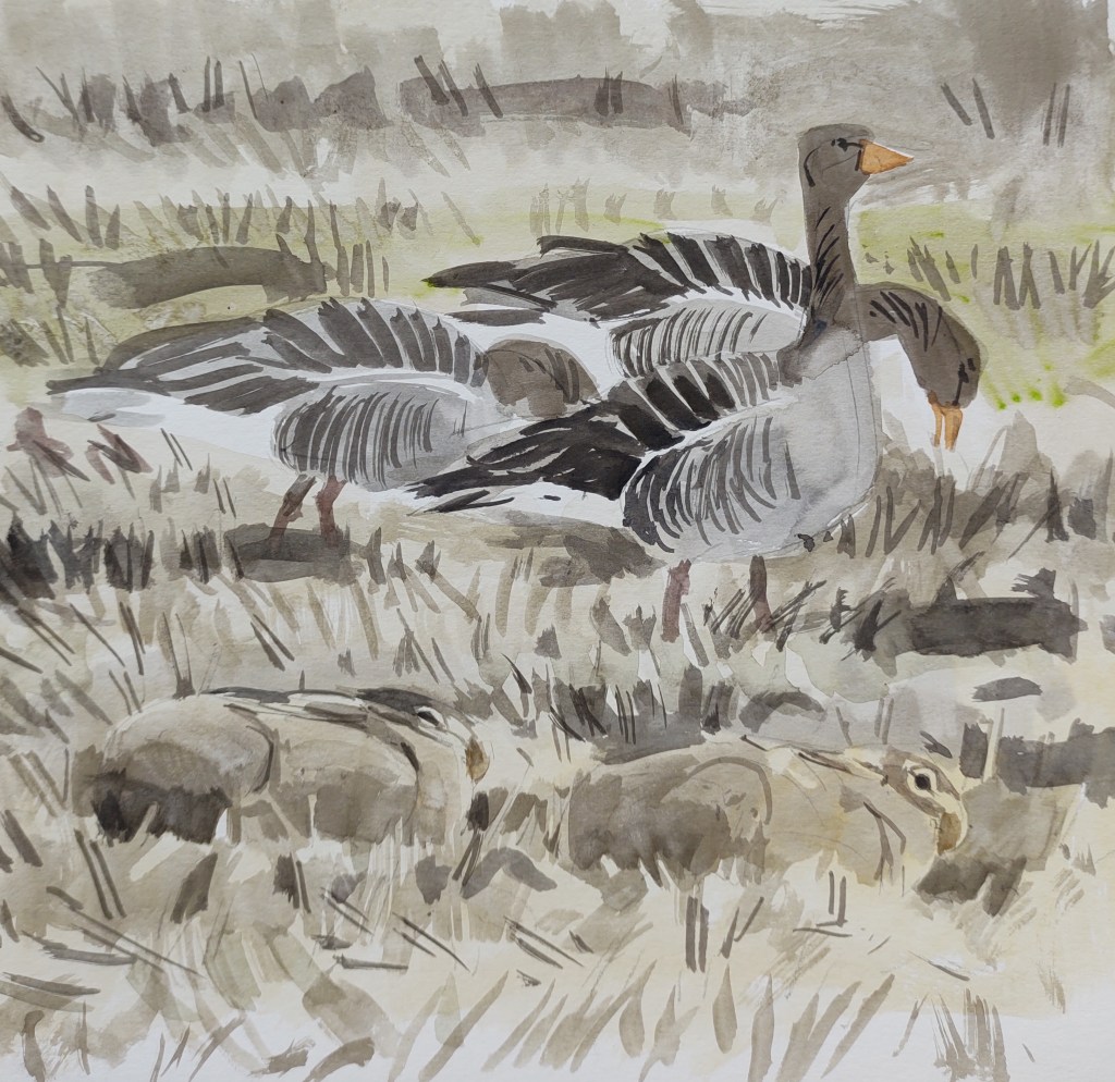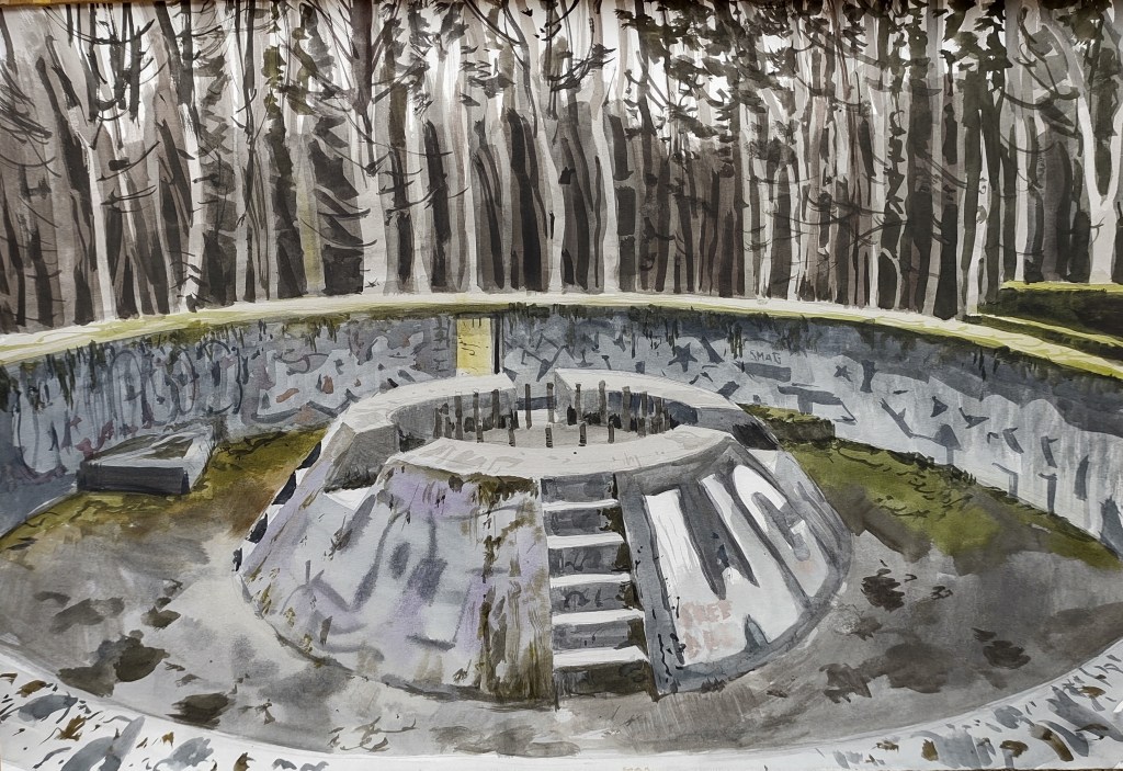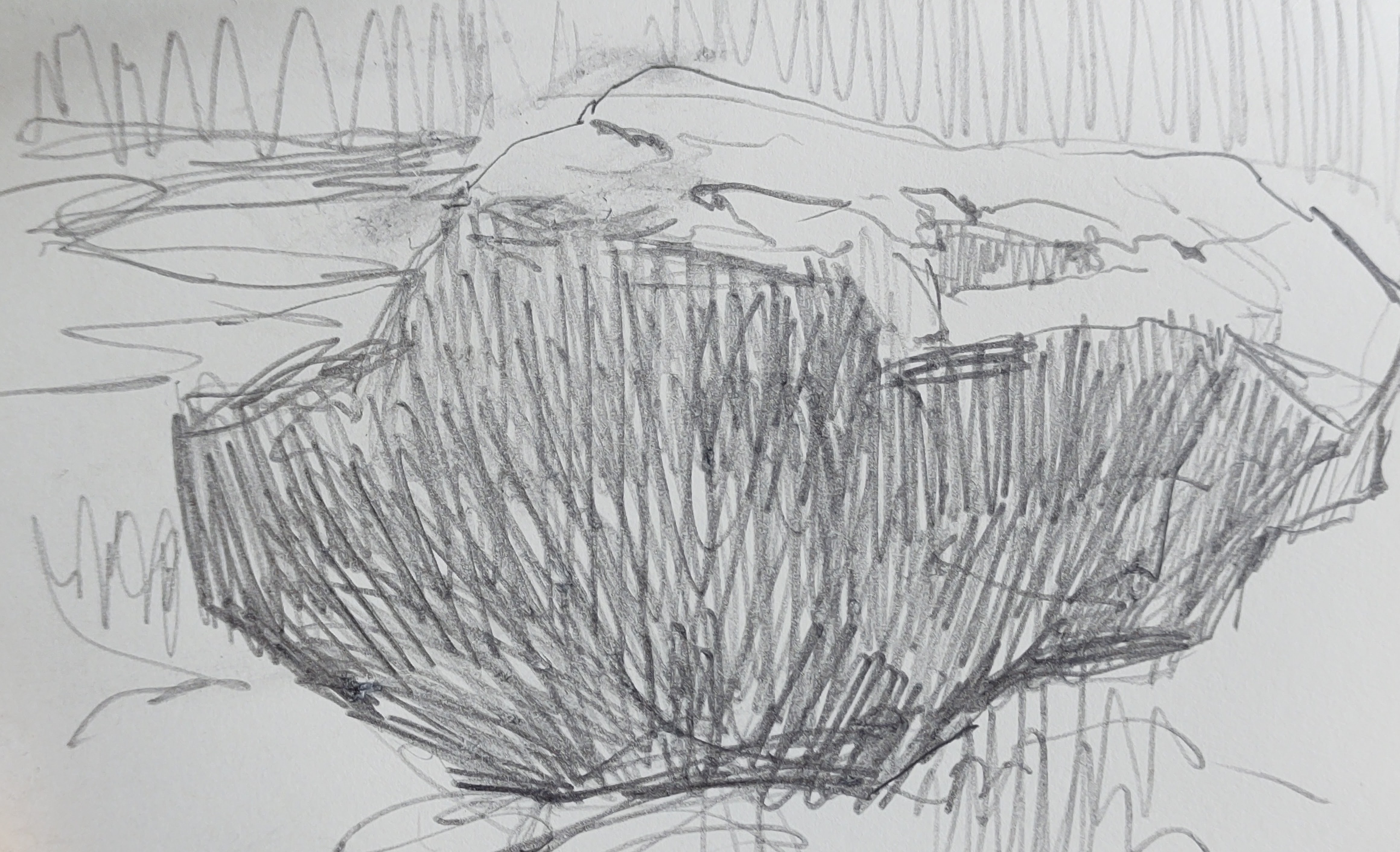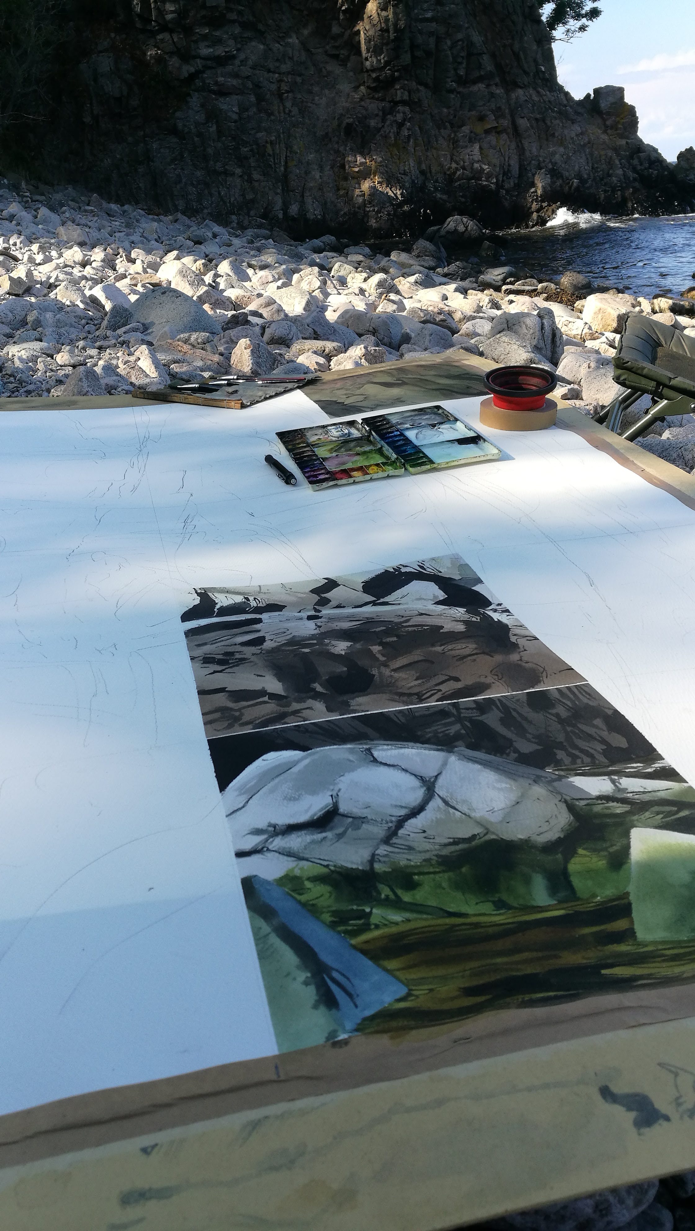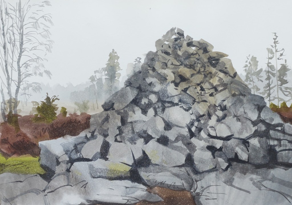 Leaving the path I headed north towards Stubbeløkken, Bornholm’s largest granite quarry. First prospected in 1873, the quarry is now a huge and deep open wound covering 18 hectares and descending to over 116 metres – 53 metres under the surface of the sea. Over the decades more than 30 million tons of granite have been excavated from this quarry alone. More than a hundred quarries on Bornholm once employed thousands of men, but this is one of the last working quarries remaining. Against the darkening sky I painted the ghostly industrial skyline, accompanied by dystopian hum of heavy machinery – but also by the screeching of thousands of gulls, and the yikkering of the recently fledged peregrine young.