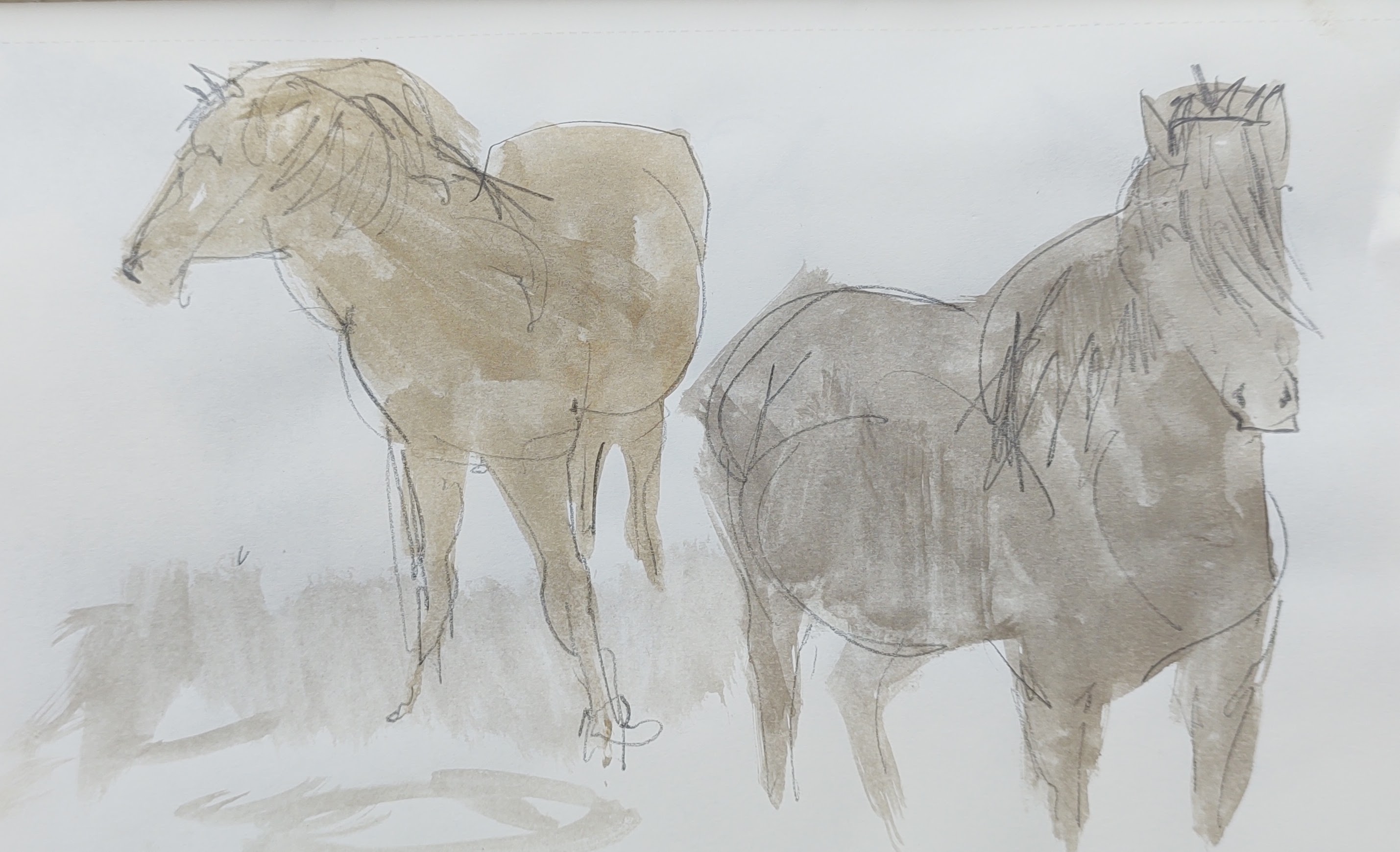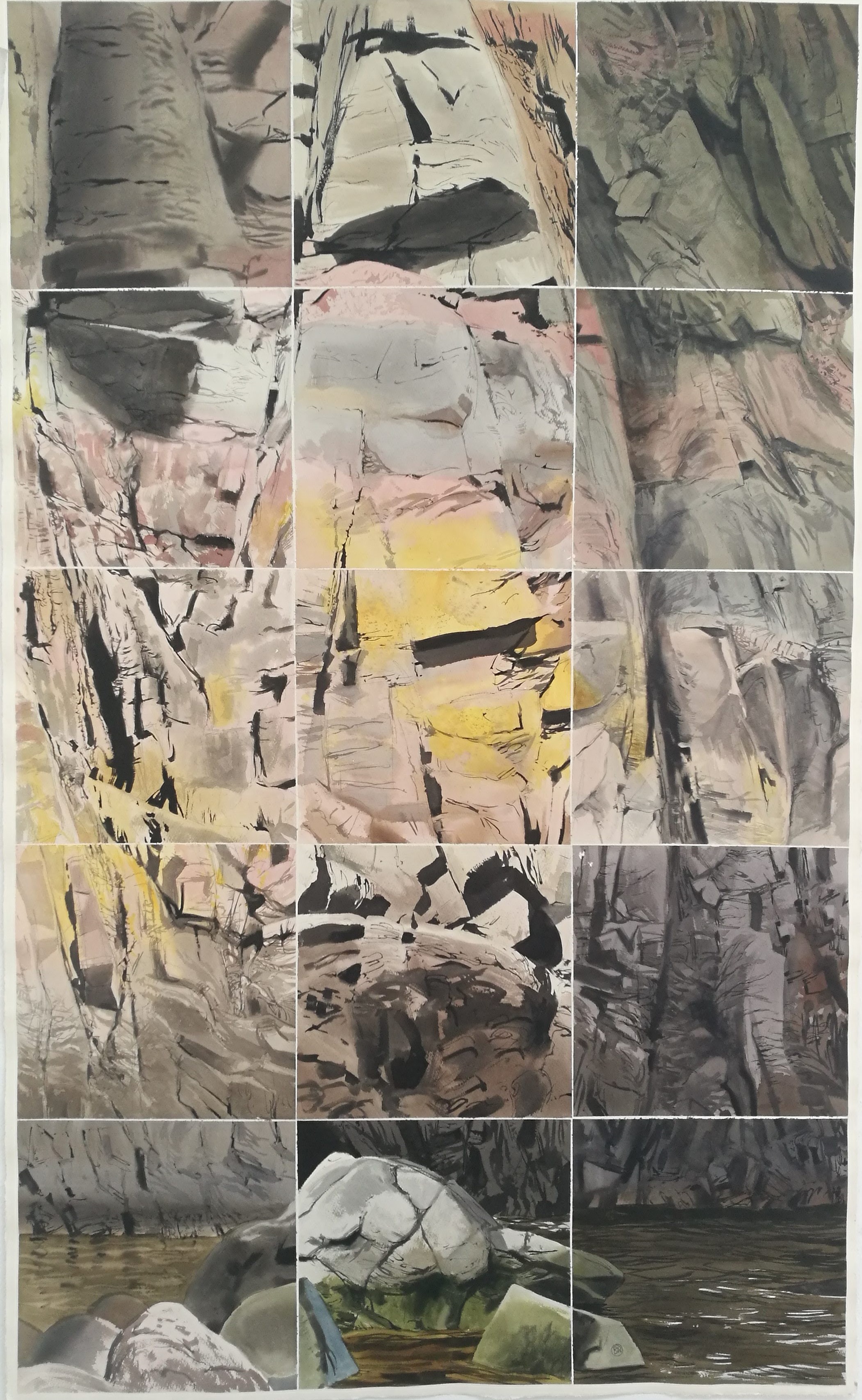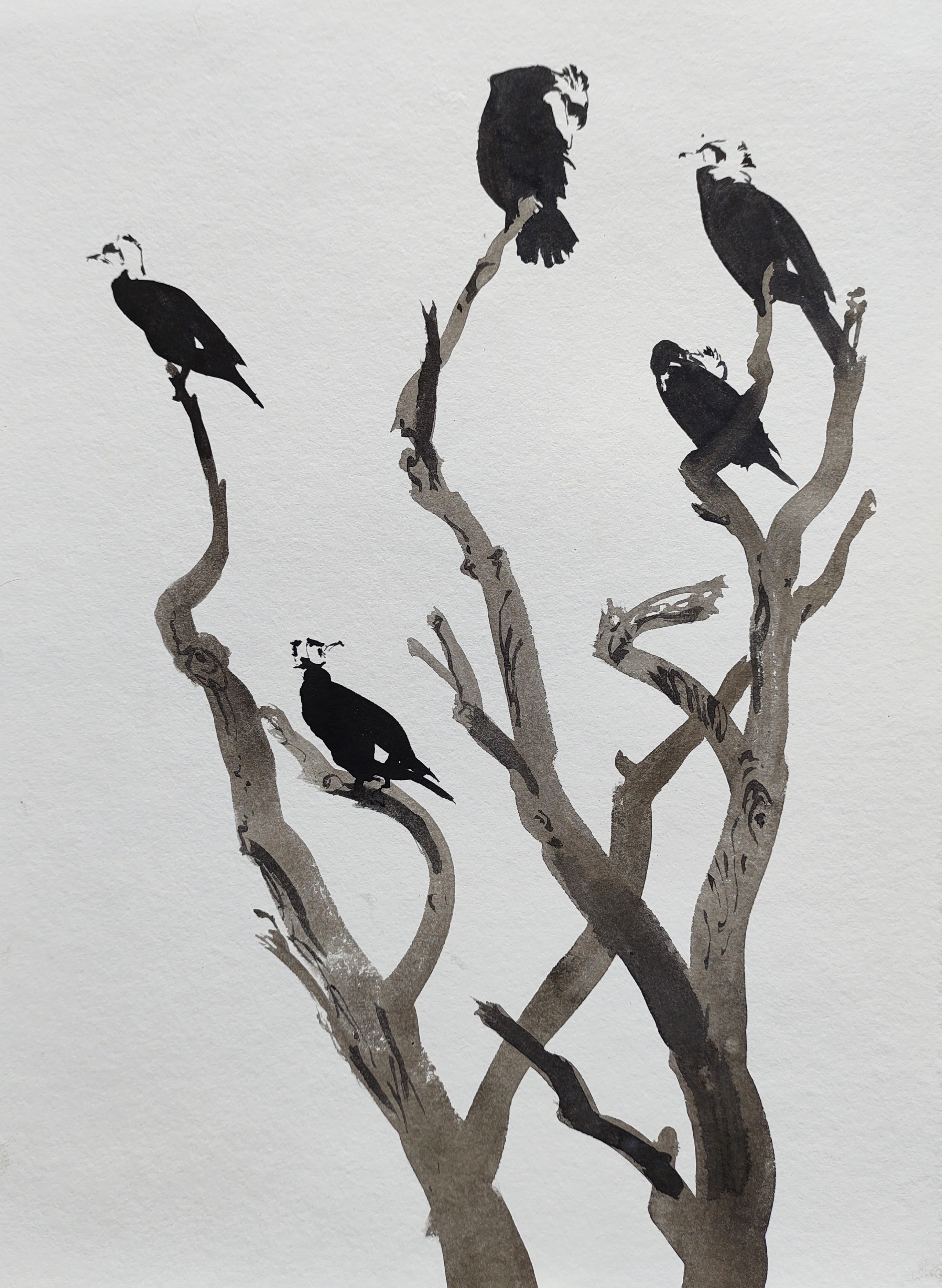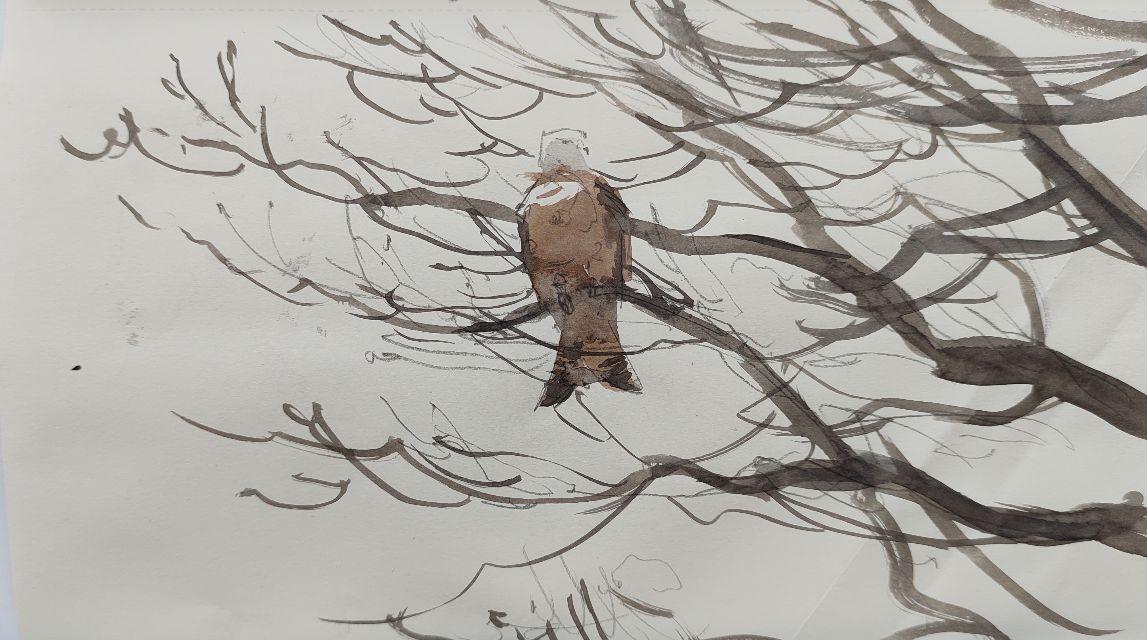 Leaving the path I headed north towards Stubbeløkken, Bornholm’s largest granite quarry. First prospected in 1873, the quarry is now a huge and deep open wound covering 18 hectares and descending to over 116 metres – 53 metres under the surface of the sea. Over the decades more than 30 million tons of granite have been excavated from this quarry alone. More than a hundred quarries on Bornholm once employed thousands of men, but this is one of the last working quarries remaining. Against the darkening sky I painted the ghostly industrial skyline, accompanied by dystopian hum of heavy machinery – but also by the screeching of thousands of gulls, and the yikkering of the recently fledged peregrine young.