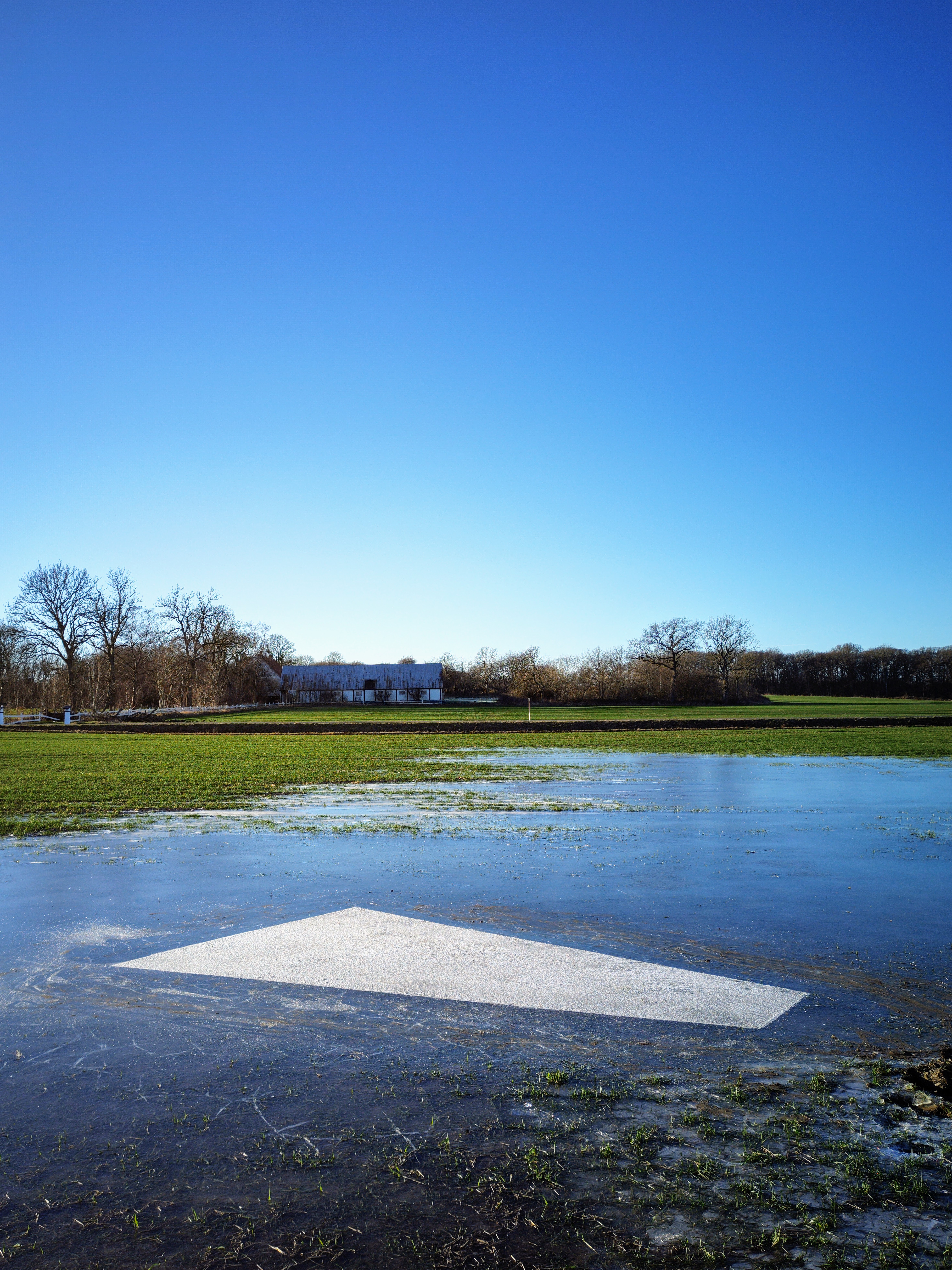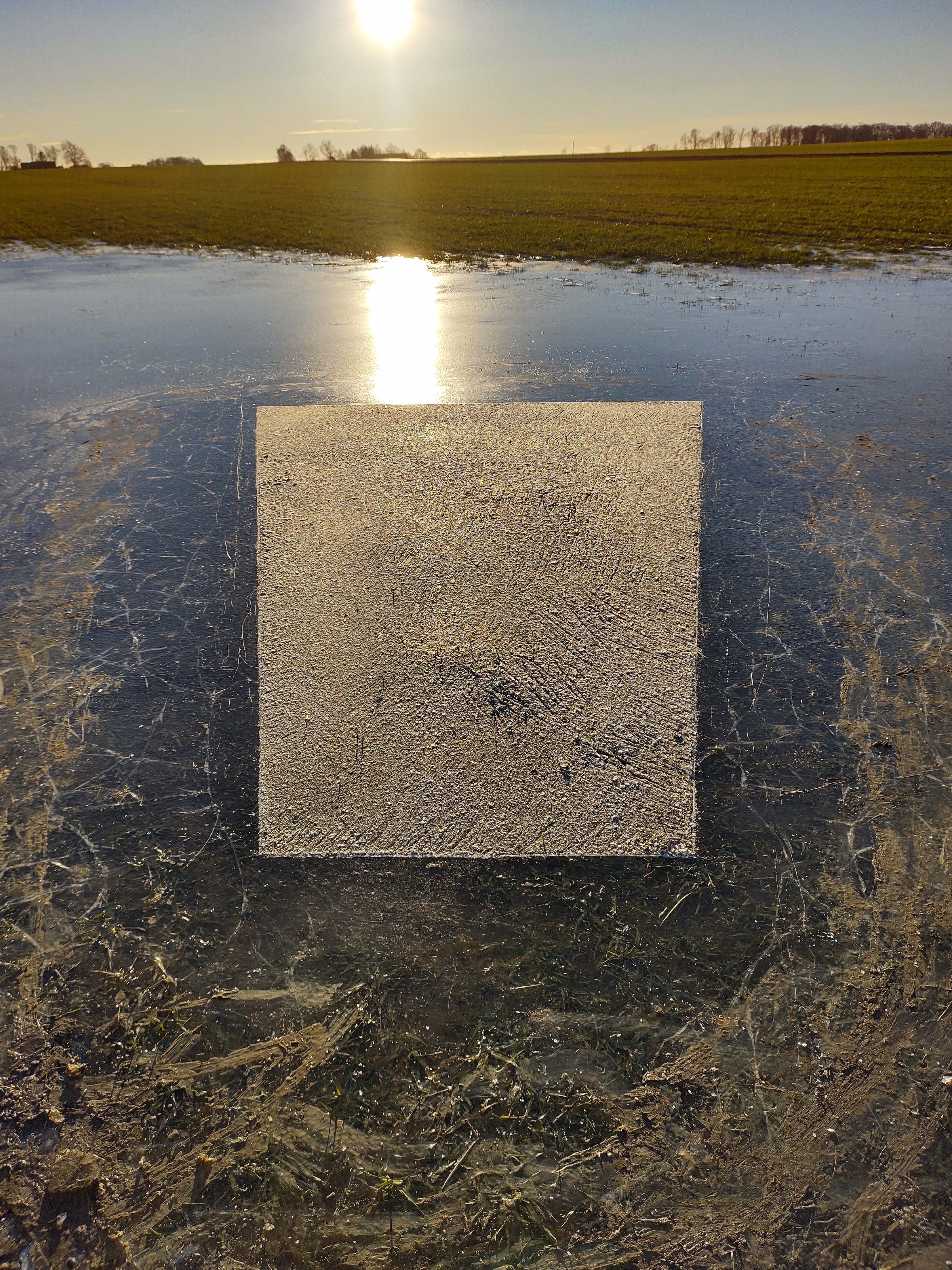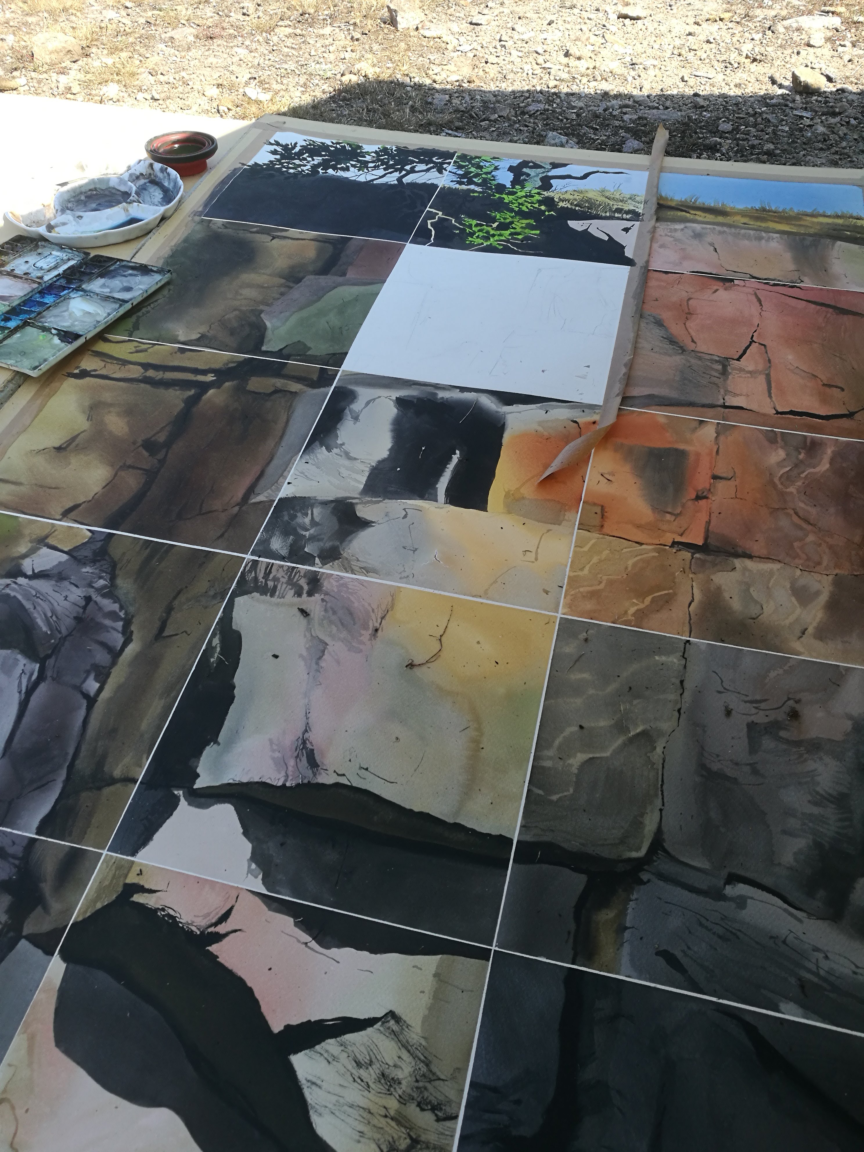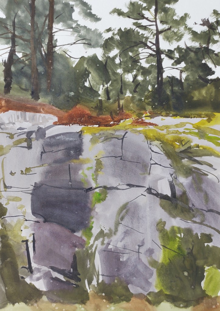 A little later I found myself gazing at the moss-filled cracks in the road. They reminded me of a painting I had made a year or two ago of bacterial biofilm cracking on the surface of a puddle in Fanø.