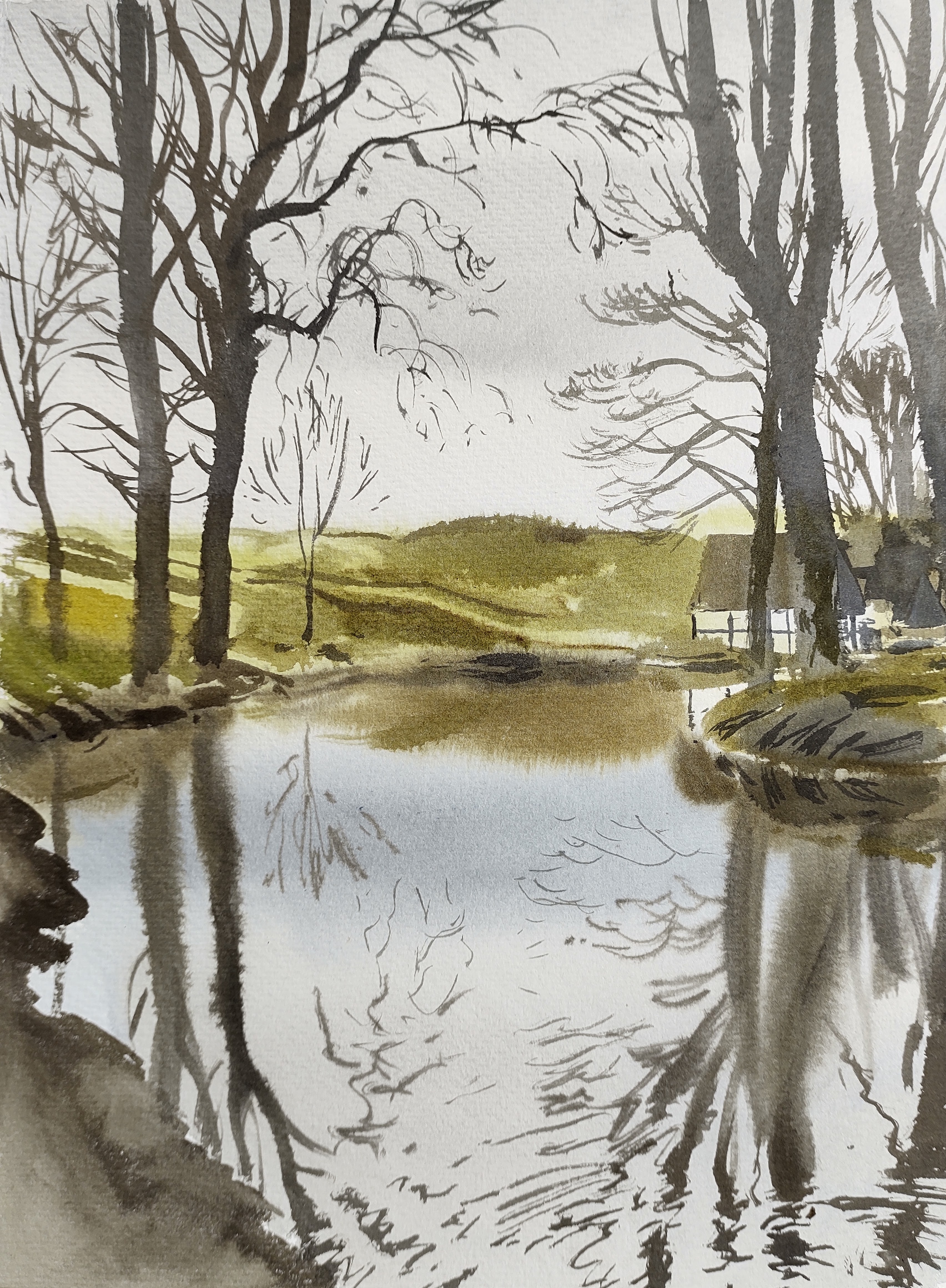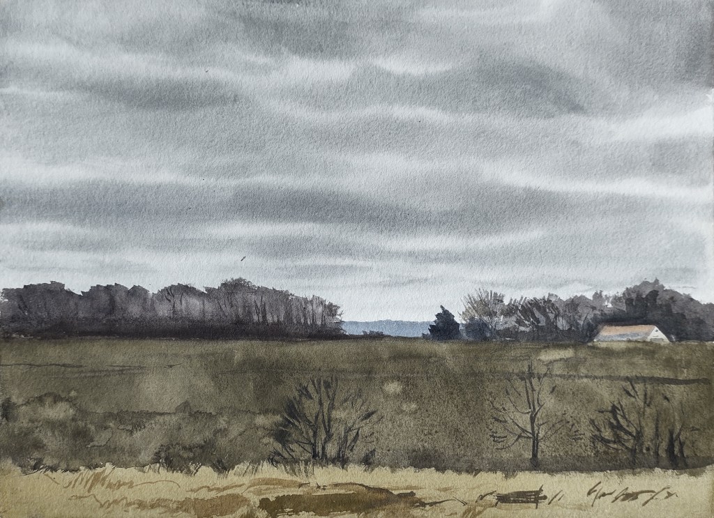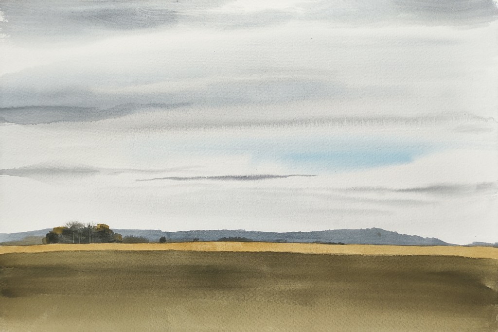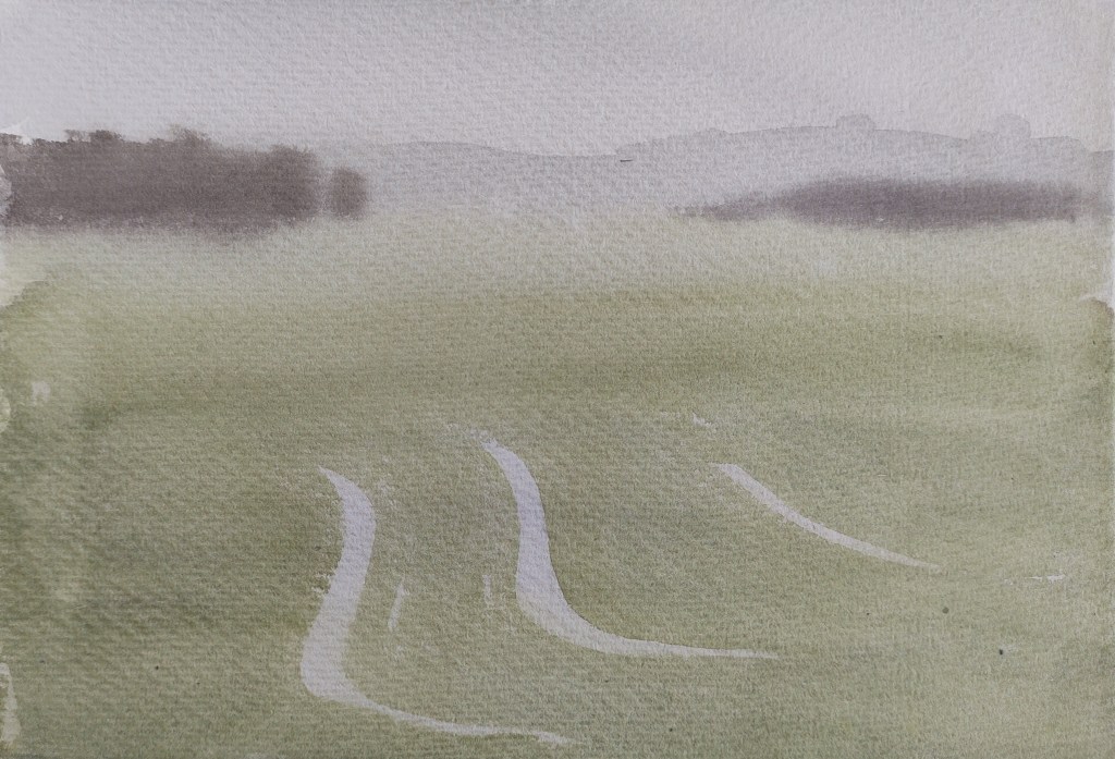 LAND 31 A stunning dawn, the sky clear and the fields draped with delicate blankets of opaque mist. The rising sun would soon change everything, so setting up I had to decide whether to try to capture the mist or concentrate on the round church instead. I decided on the church, it having been a while since I tried a ‘slice painting’. Luckily, the changing light and sky made for an interesting composition.