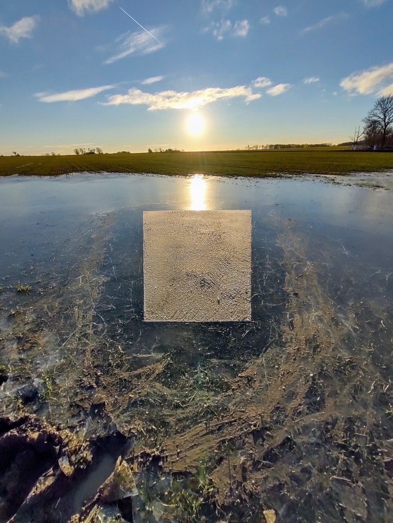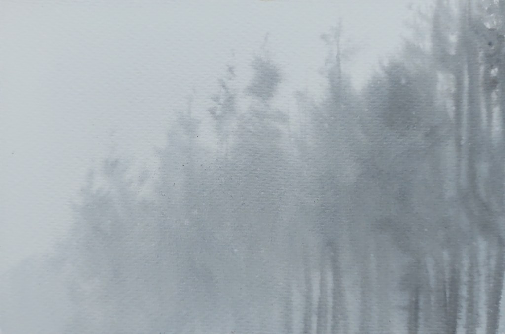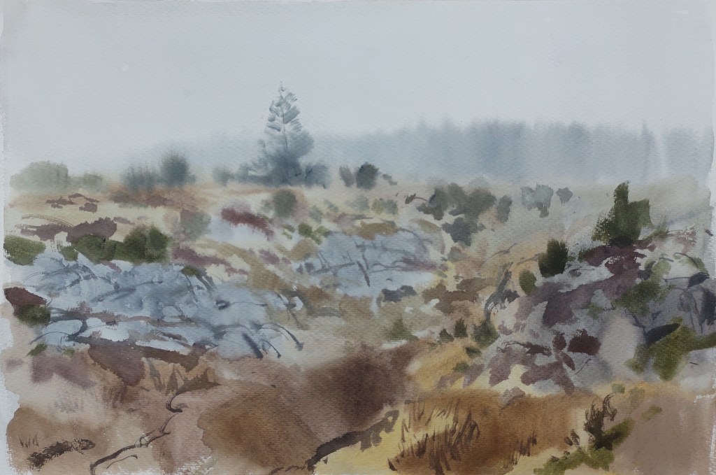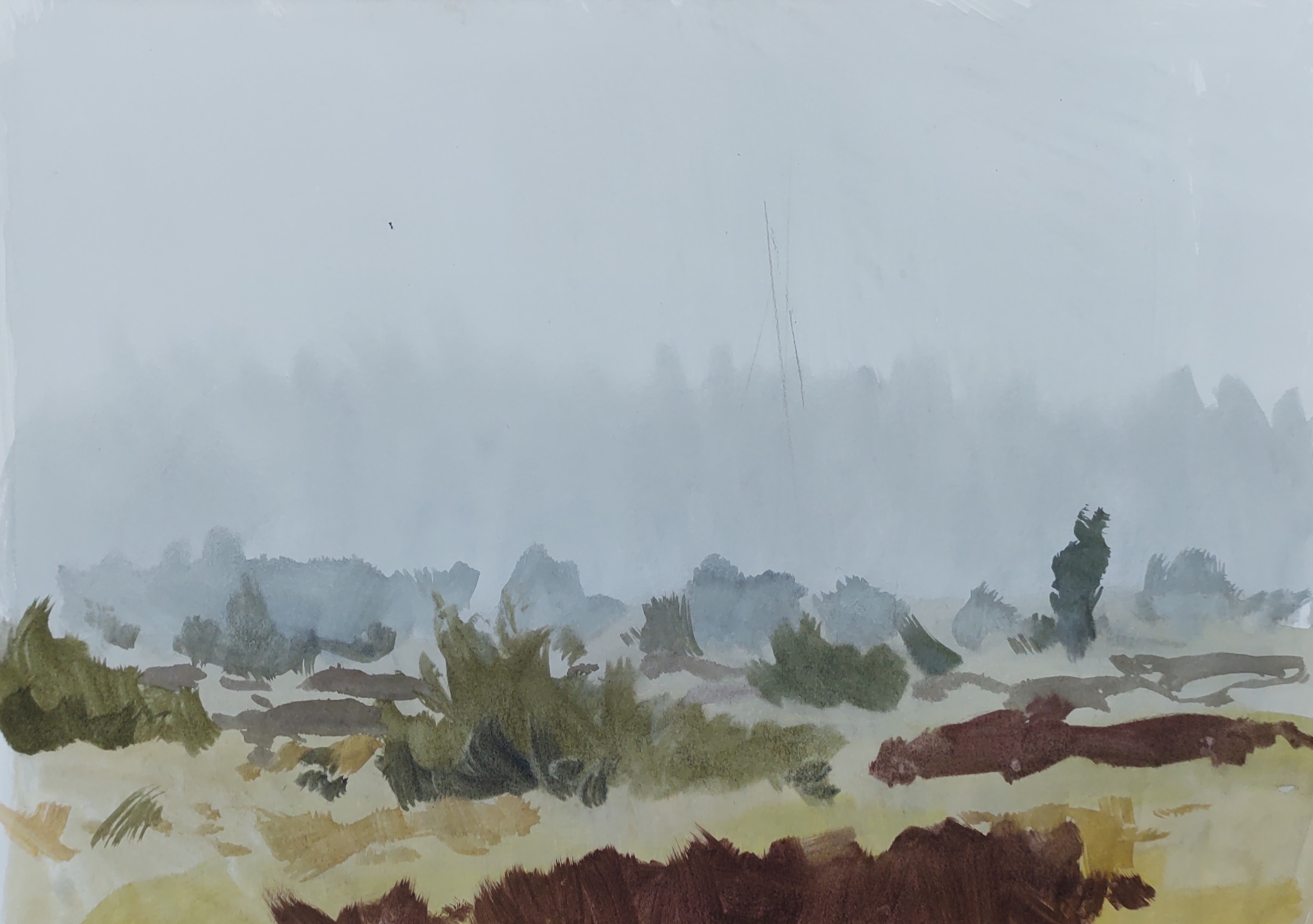 LAND 31 A stunning dawn, the sky clear and the fields draped with delicate blankets of opaque mist. The rising sun would soon change everything, so setting up I had to decide whether to try to capture the mist or concentrate on the round church instead. I decided on the church, it having been a while since I tried a ‘slice painting’. Luckily, the changing light and sky made for an interesting composition.