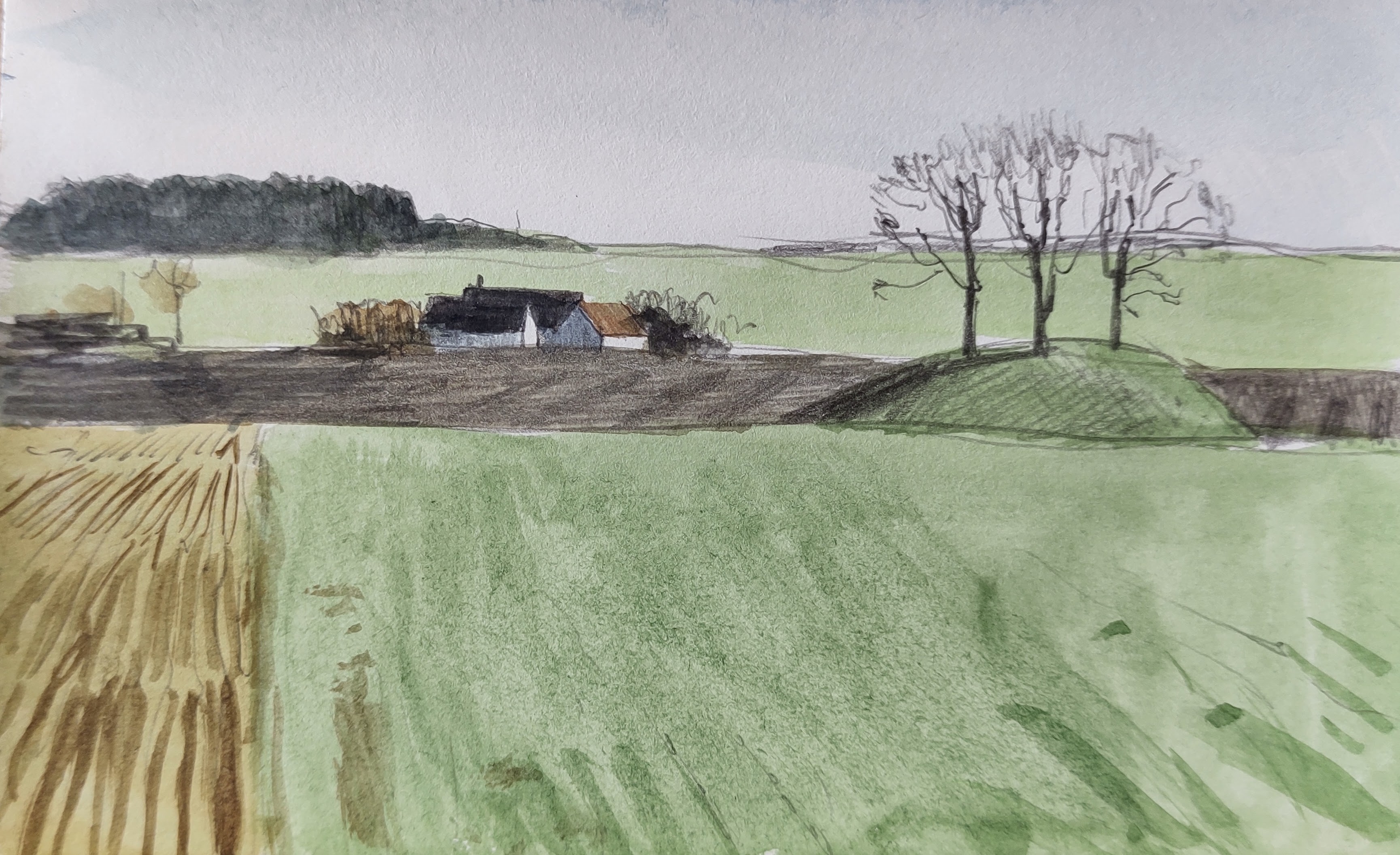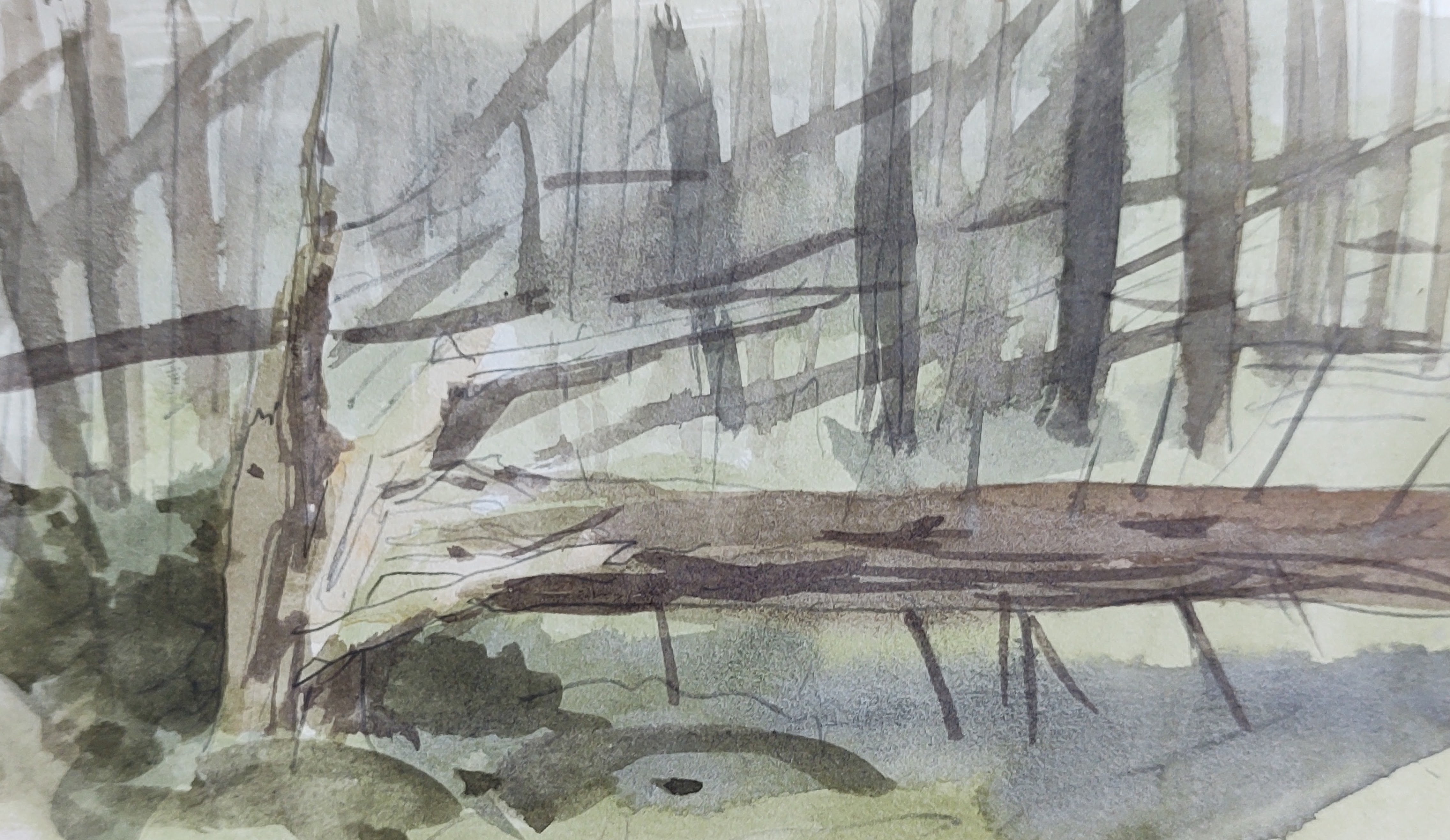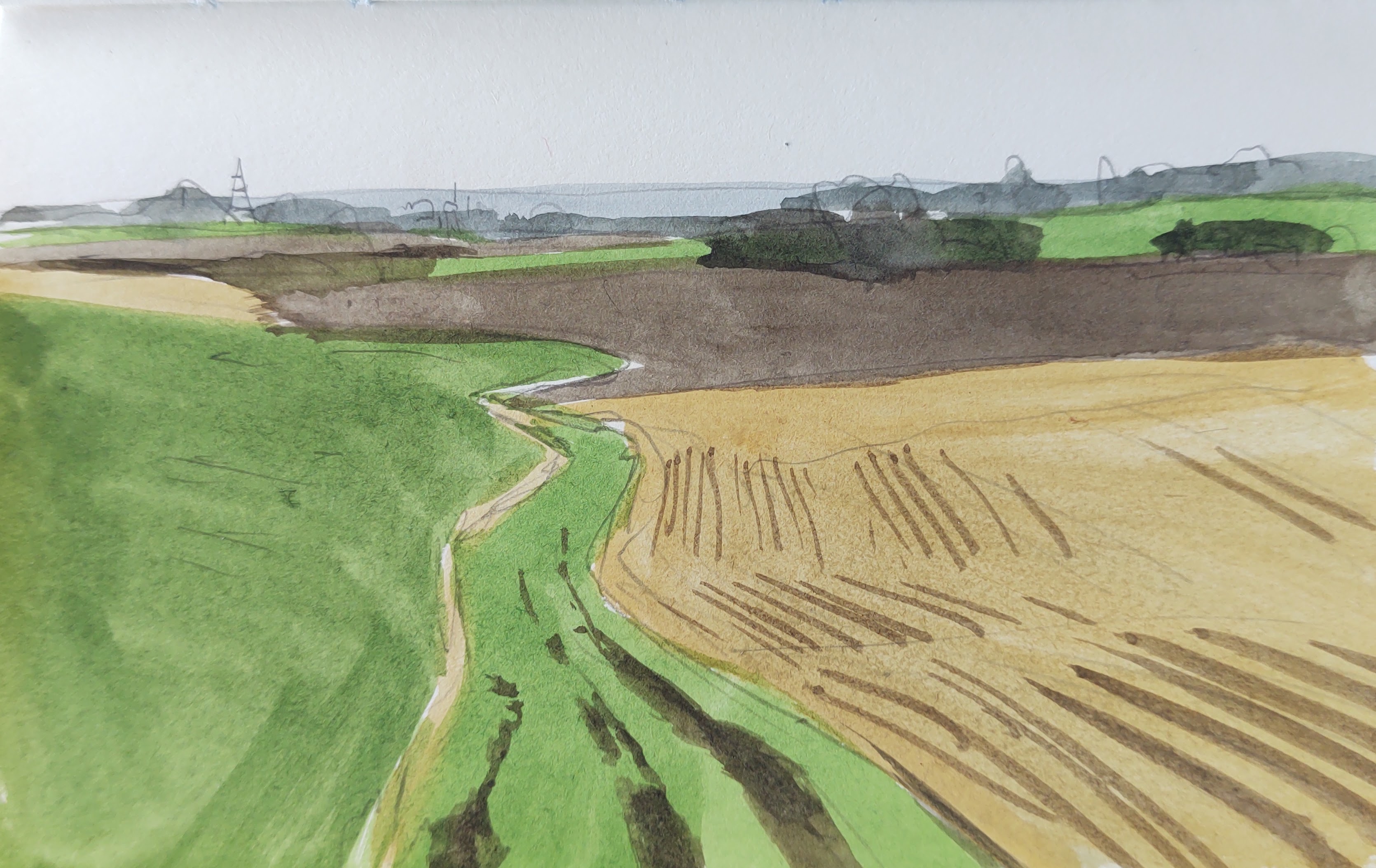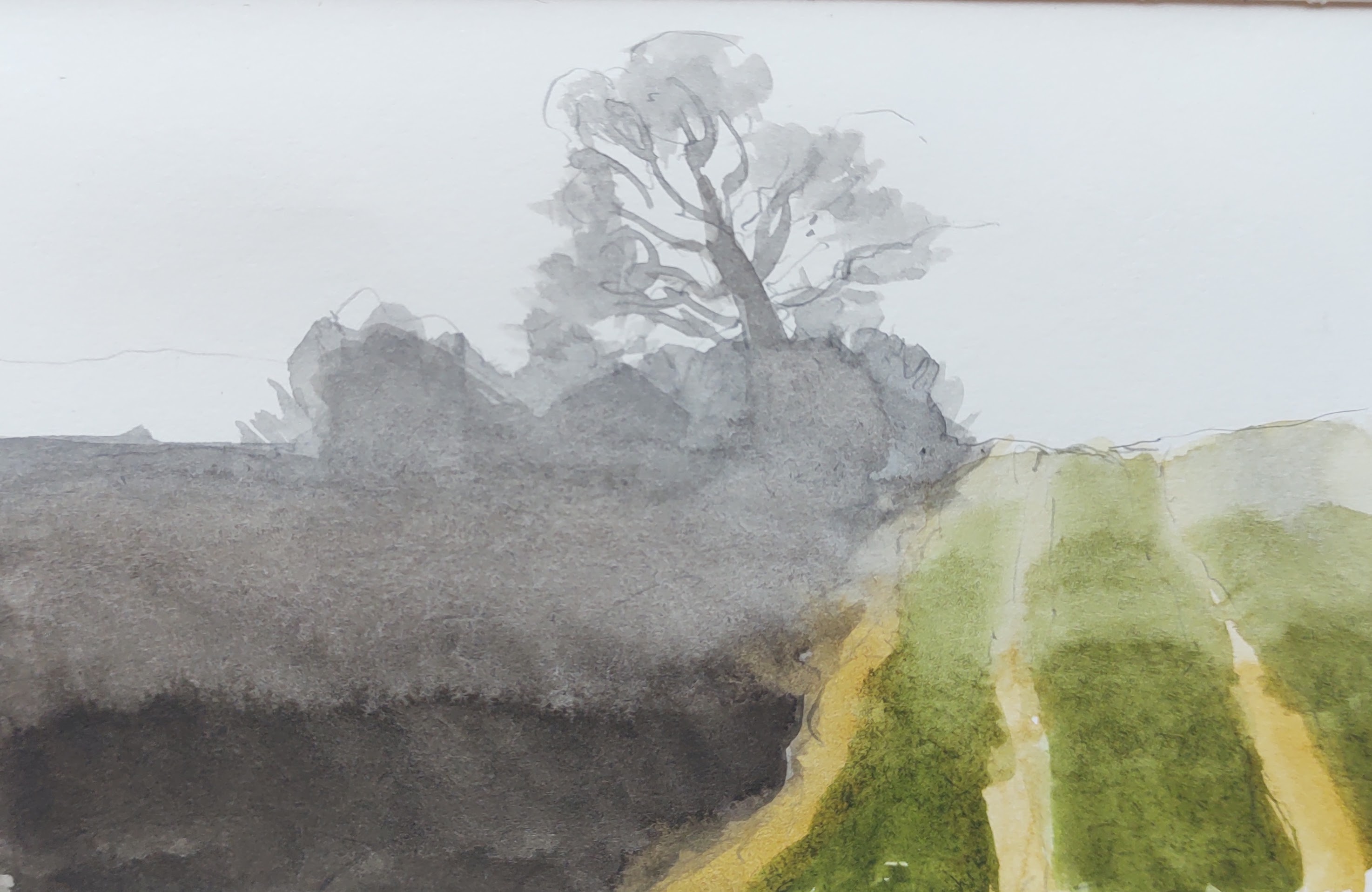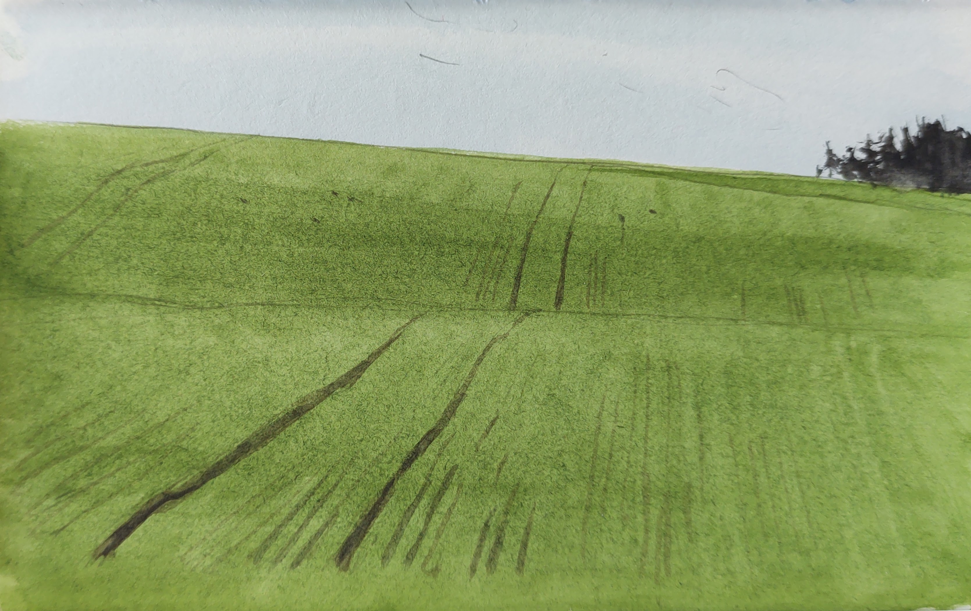 The wood bordered a maize field. I spent a long while trying to capture the different greens and how they fitted together. By the end of it my eyes and brain were exhausted.