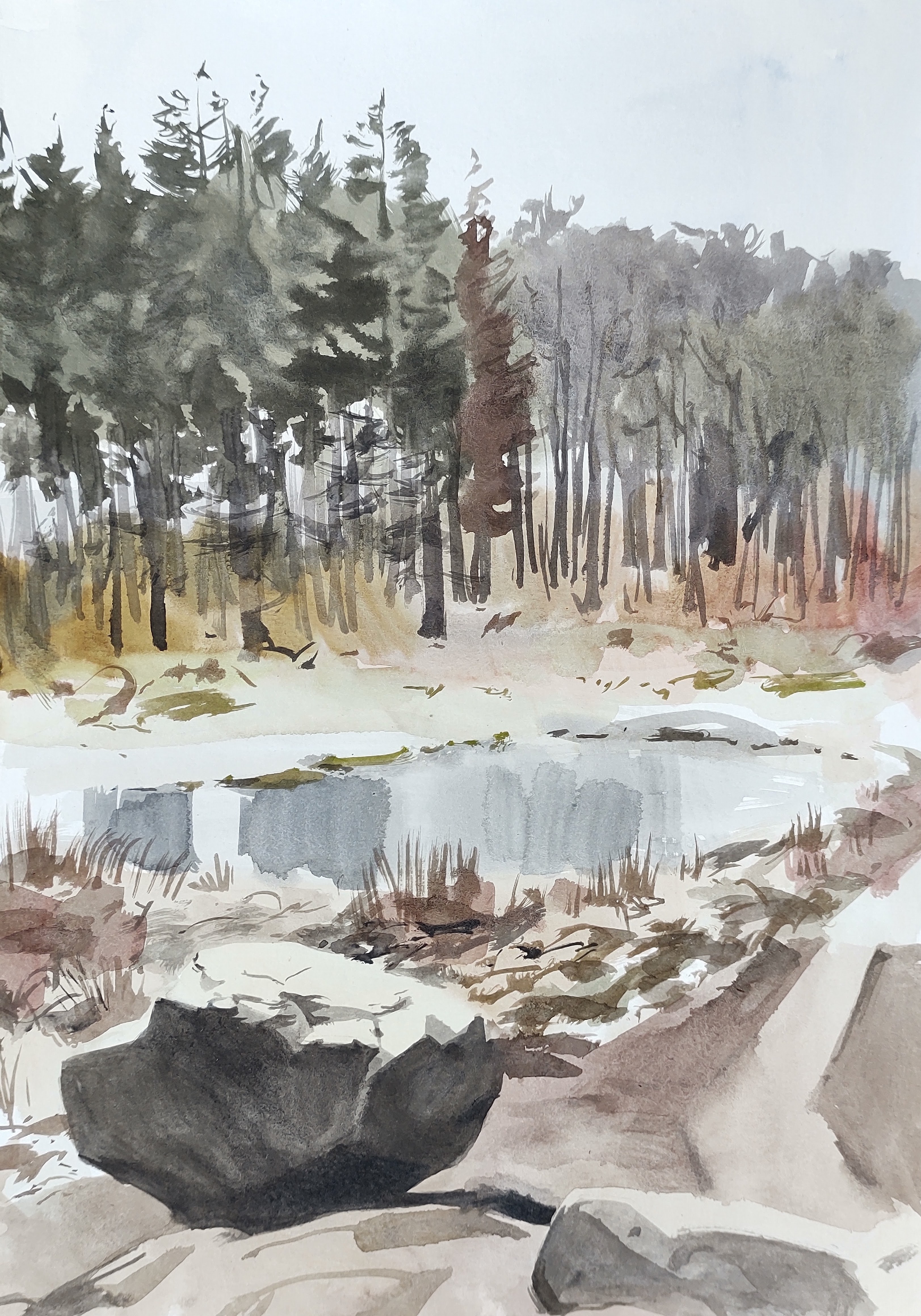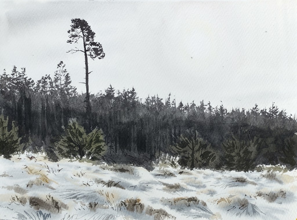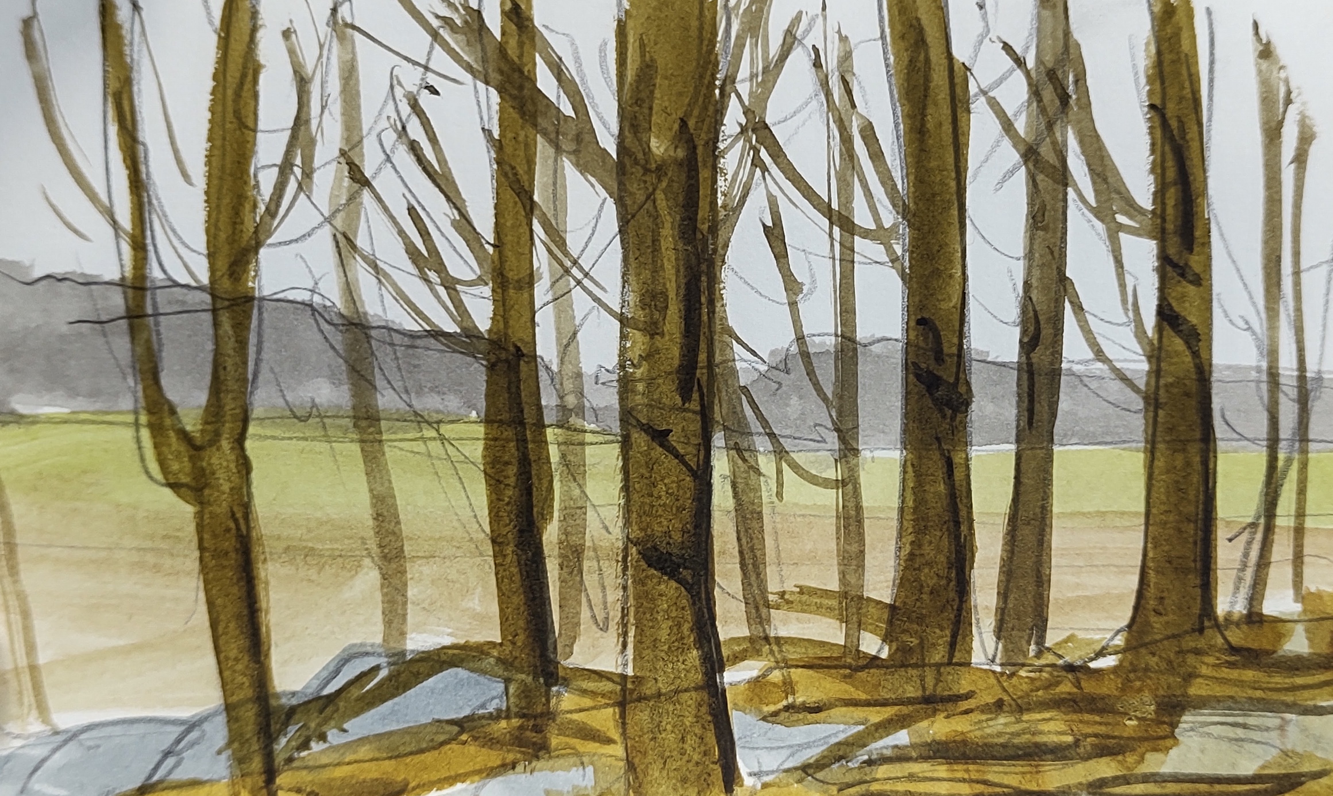 The rain soon abated and I continued, zigzagging through an undulating agricultural landscape along narrow country roads, surrounded by waterlogged loamy fields and patches of woodland. The weather was changeable, the sky dynamic, and there was a pleasing energy to the day. I made several small landscape studies in my sketchbook.