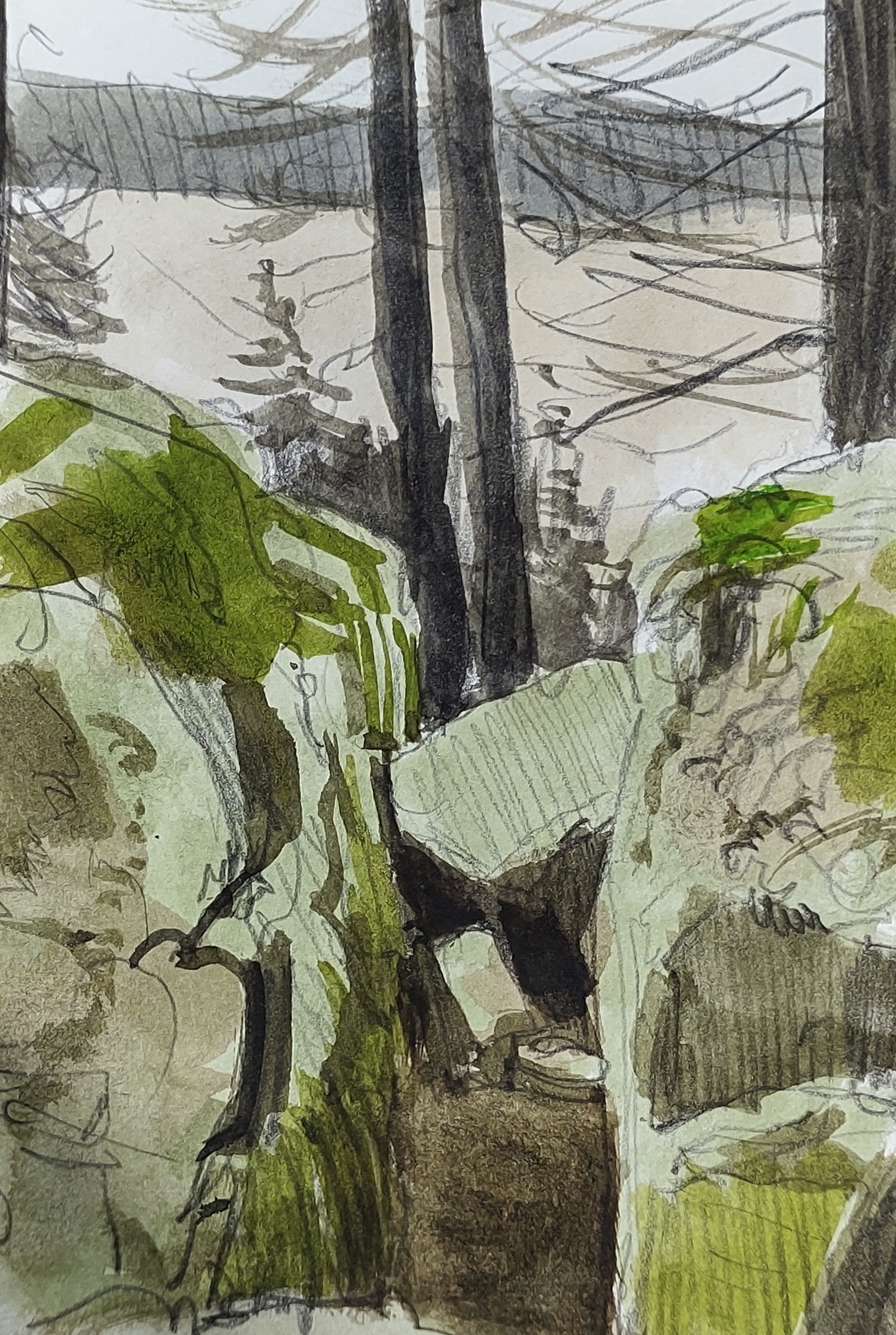 I continued through the dense woodland along a barely detectable path that took me over a ridge and back down into Ravnedal. I emerged wet, muddy and disoriented from the forest, and enjoyed the great view across the valley. Here I sheltered from the light drizzle under my tarp and painted the burnished golds and yellows of the beechwoods.
