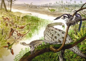A painting for an exhibition on the dinosaur life of Bornholm. The painting was reproduced at approximately 3 by 5 metres