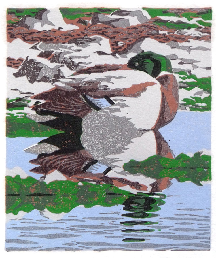 Lino-cut, 140 x 170mm, edition of 25, £85. One of a series of six ‘anas’ drake studies