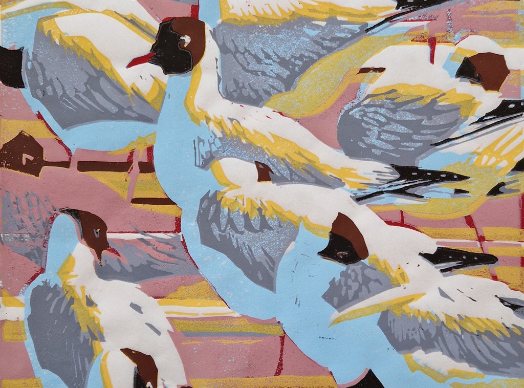 In the studio, I make small editions of limited-edition lino-cut prints, based on my sketches and fieldwork. I often use the reduction method with one plate and several colours.