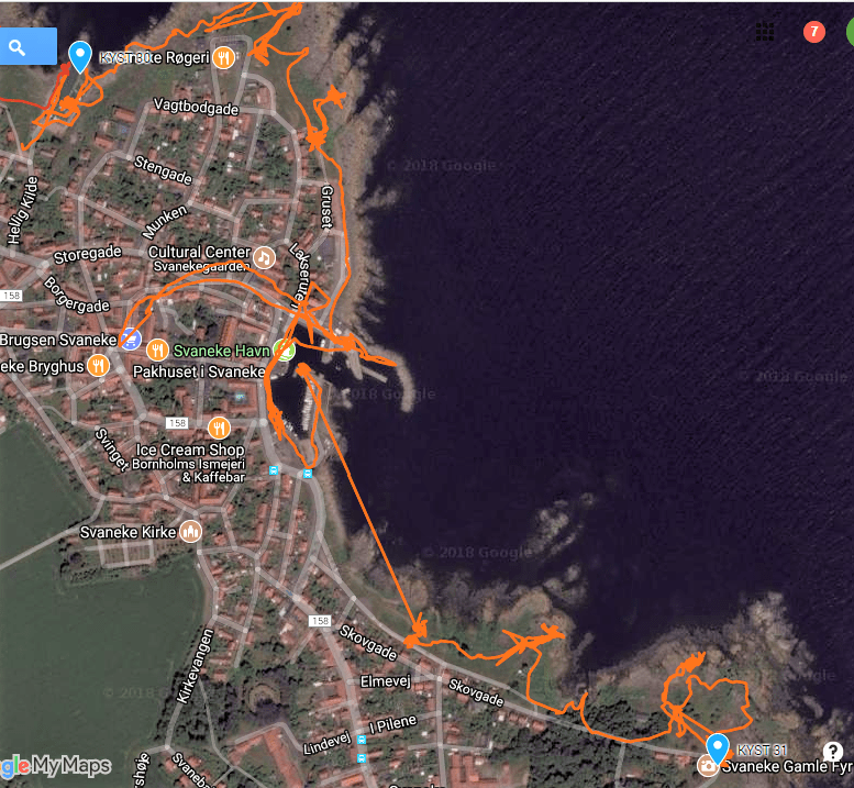 Jeg gik videre, og gik rundt omkring Hullenakke foran fyrtårnet. Solen var ret lav nu, og jeg kikkede tilbage til den historiske og smukke Svaneke – en af Bornholms mest populære rejsemål (og stedet hvor KYST udstillingen åbner næste maj). Kirken, Svanemøllen og Jørgen Utzons vandtårnet kunne alle sammen ses og en svanefamilie svømmede i forgrunden (det var først bagefter, at jeg blev klar over, at Svaneke betyder noget i retningen af Svanens Vig…).