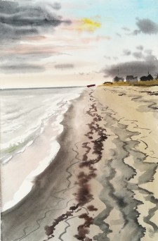 Endelig nåede jeg dagens mål, Levka strand, hvor jeg sad foran en kæmpe himmel. Vinden var begyndte at blæse lidt op, og jeg besluttede mig for at lave et billede i ’striber’ for at fange de skiftende farver og toner. Det hele var i konstant bevægelse og jeg var meget træt men også lidt overvældet. Godt at jeg blev hentet i dag.