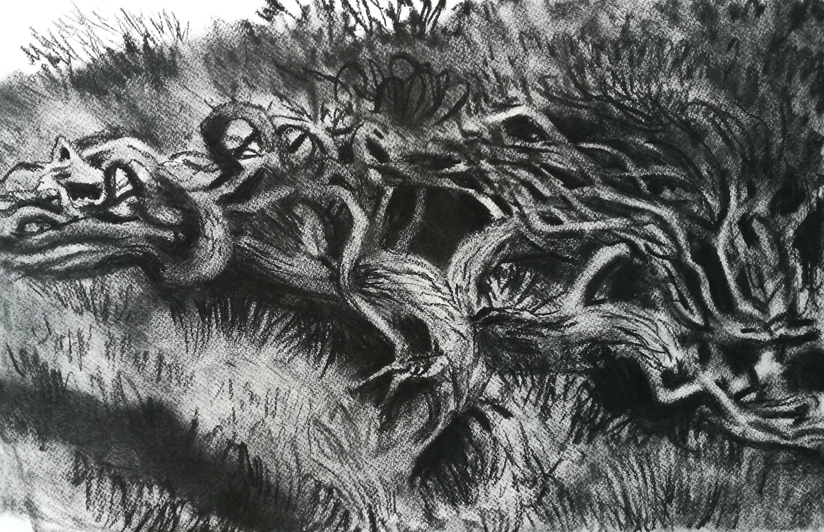 Jeg gik nordpå, mod de gamle fiskeryutter ved Sorthat Odde. Solen var nu oppe, og de fine farver sammen med stregerne på sandet fra bølgeren fangede mit opmærksomhed. Jeg lavede en kultegning af et rodsystem fra en skovfyr. Det var helt sort i midten, og lignede porten til de underjordiske.