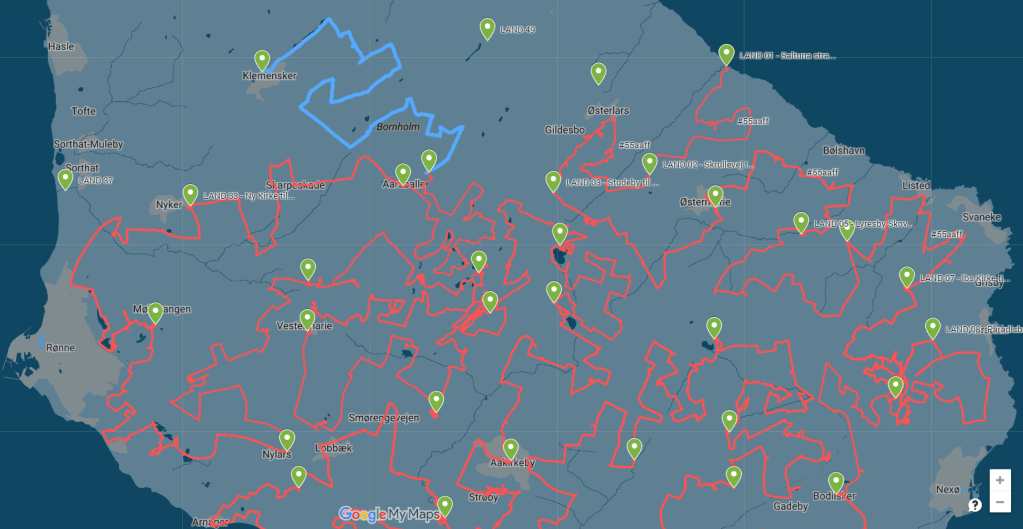 LAND 35 startede, som den forrige tur var endt – med grå himmel og silende regn. Iført mit regntøj gik jeg mod nordøst på den regnvåde vej, mens traktorer og lastbiler skreg og hvæsede forbi mig. Jeg var glad for at dreje ind på en roligere vej og derefter igen ind i en lydløs skov, hvor jeg vadede gennem knæhøjt vådt græs gennem en ung birke- og granplantage mod Rø-senderen, en 315 meter høj gittermast fastspændt med stålbarduner, der tårnede sig op over mig og faktisk hele Bornholm.