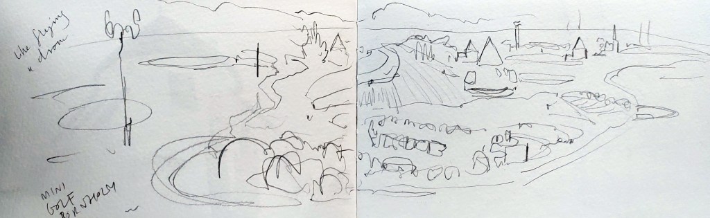 Jeg forlod kirkegårdens læ og gik mod nordvest ind i stormens tænder. Jeg stoppede kort ved en minigolfbane, der var bygget i form af Bornholm, og som indeholdt skalamodeller af mange af Bornholms vartegn og turistattraktioner. Efter at have gået rundt på øen i de sidste 51 uger virkede det ganske passende at få mulighed for at se hele Bornholm foran mig på én gang.