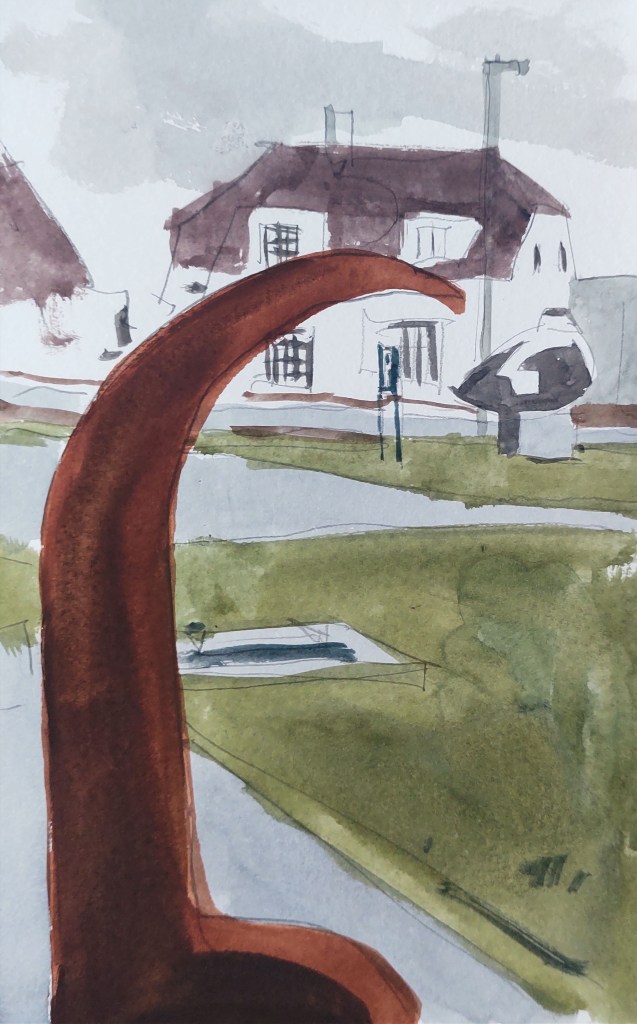 Det var en kamp at håndtere alt mit grej i vinden, så jeg besluttede at se, om jeg kunne arbejde med elementerne i stedet. Jeg dyppede nogle græstotter i akvarelmaling og lod dem lave mærker på papiret. En forfriskende afstikker, men resultatet var utilfredsstillende.